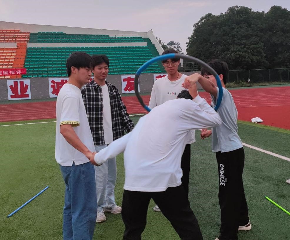 传递团圆活动——活动分为五人一组,彼此牵手,在手不松开的情况下把呼啦圈完成首尾传递,用时最短的一组获胜。同学们手拉着手,齐心协力完成游戏。
