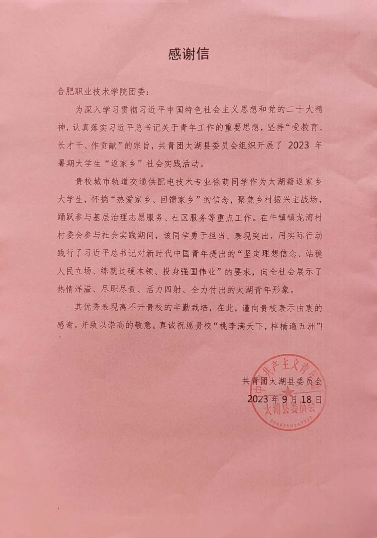 此外,Beat365学子在暑期“返家乡”实践中,也积极踊跃参与基层治理志愿服务、社区服务等重点工作。在家乡建设中挥洒汗水,用实际行动践行习近平总书记对新时代中国青年提出的“坚定理想信念、站稳人民立场、练就过硬本领、投身强国伟业”的要求,向家乡人民展示了热情洋溢、尽职尽责、活力四射、全力付出的合职青年形象。他们的辛勤付出也收到当地政府的充分肯定,并向Beat365寄来了感谢信。