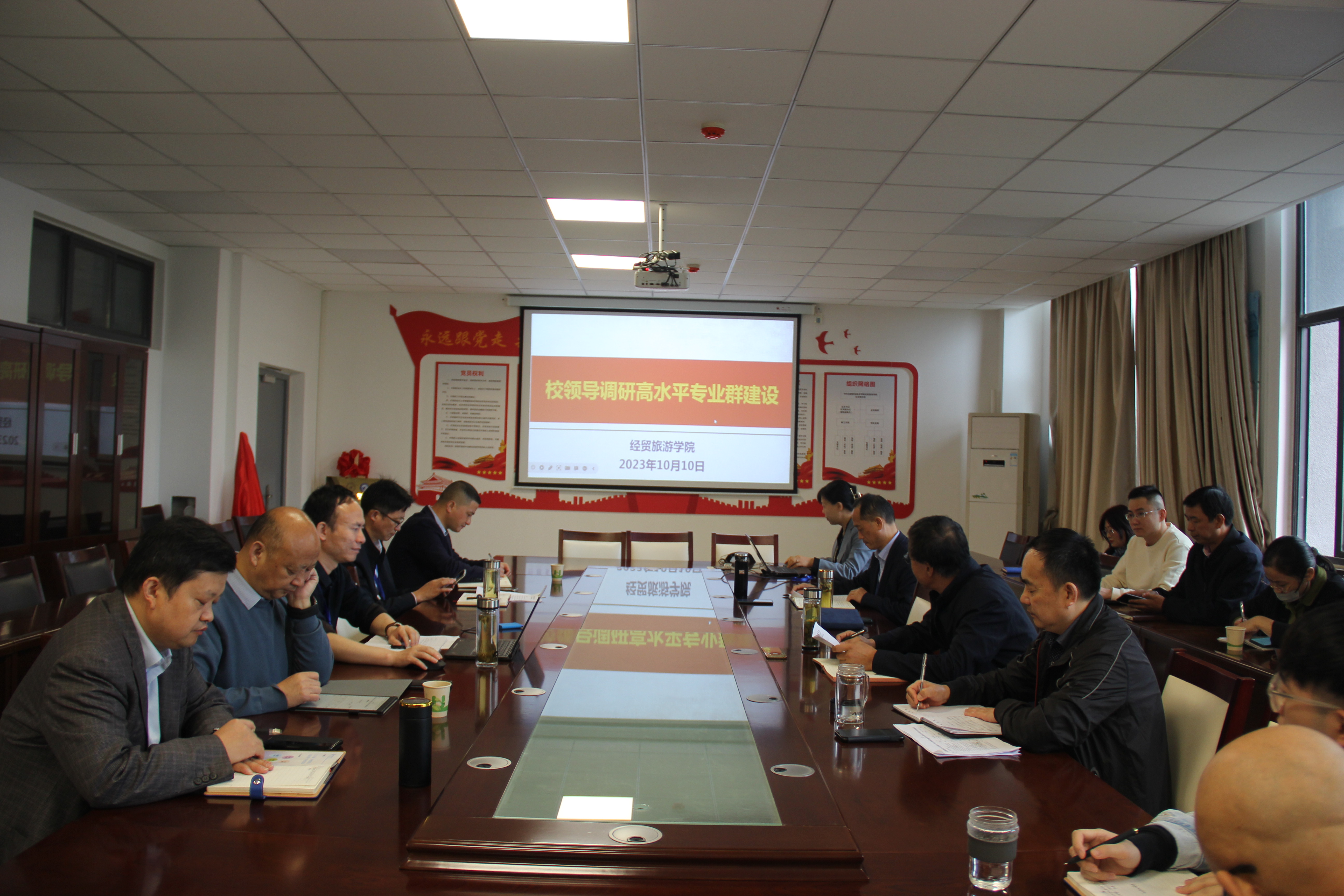 为进一步推动高水平专业群建设,全力促进学校内涵建设和高质量发展,10月10日上午,校党委副书记、校长檀明,校党委委员、副校长周晓隆,教务处处长窦红平,科技处处长胥振国,发规处处长方鲁兵等赴经贸旅游学院调研面向产业的高水平专业群和特色产业学院建设情况,经贸旅游学院党政班子成员、各教研室主任以及骨干教师代表参加了会议。会议由经贸旅游学院党总支书记梅亚松主持。