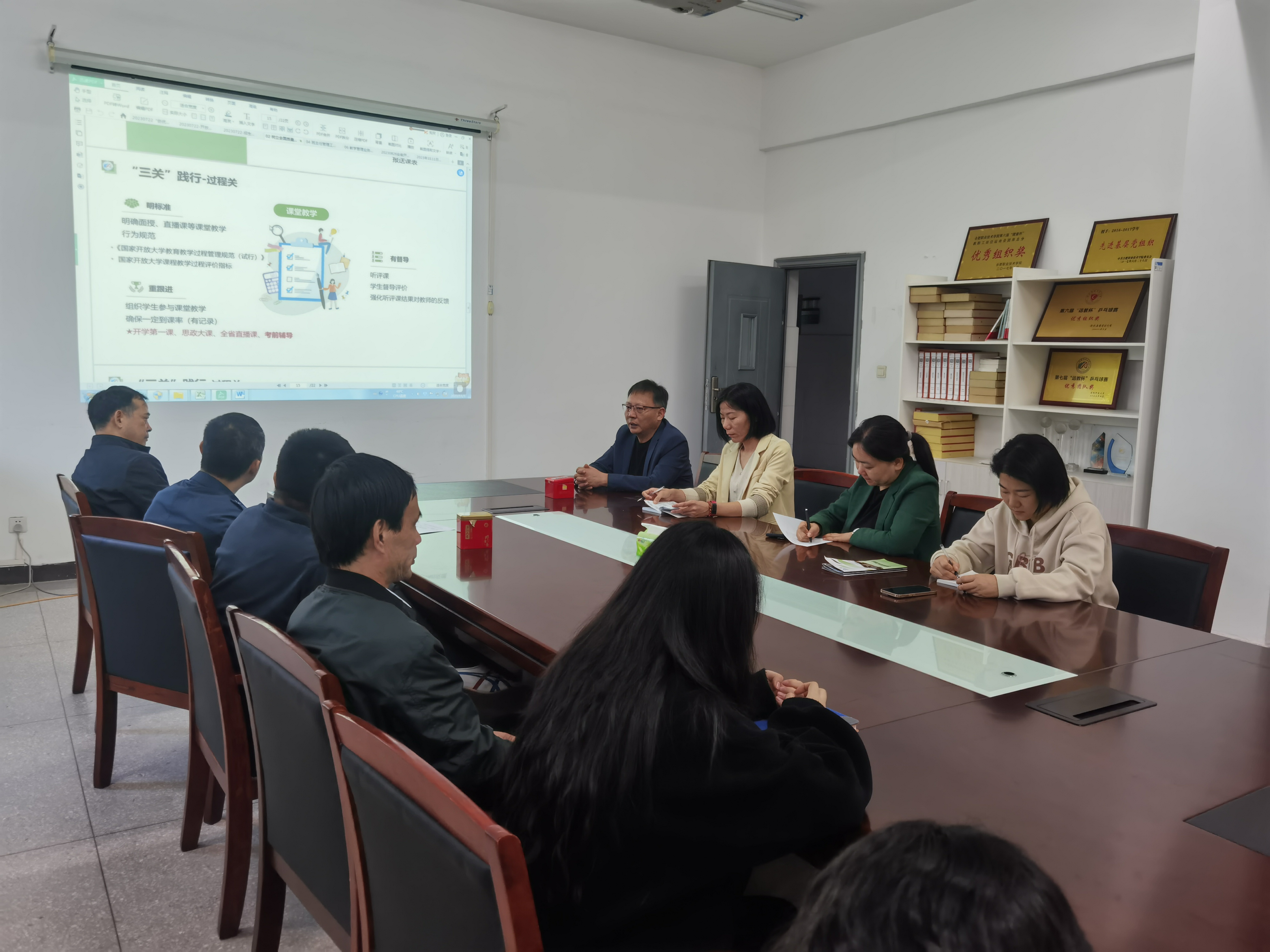 会议首先学习领会“创优提质”战略背景下安徽开放大学对全体系教务教学工作的新要求。学习内容包括以下五个方面,一是开放大学历史和开放教育特点,二是“创优提质”战略背景下开放教育教务管理在学科专业和课程建设管理、教学过程管理、学籍学位管理、考试组织管理、课程思政、教学督导质量管理等六大方面的新作为,三是全面了解安徽全省开放教育的招生与体系建设情况,四是安徽开放大学质量管理的十二个关键词,明确开放教育质量管理的关键考核指标,五是安徽开放大学教材配置情况。
