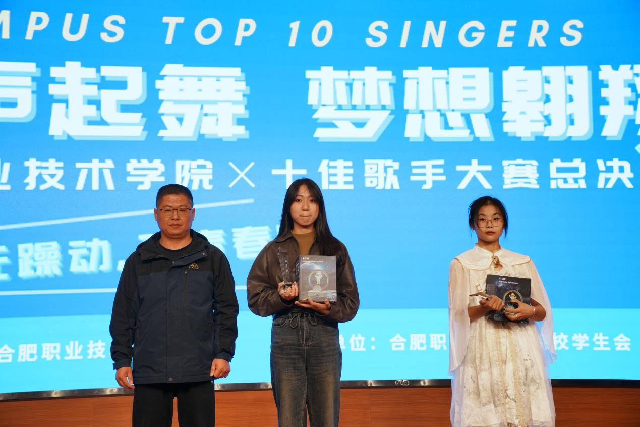 最终,安徽省十佳歌手大赛总决赛冠军何声钰学长倾情献唱《最美的期待》,将大赛拉到高潮。在大家的阵阵掌声和评委的公平公正的打分后:肖瑶同学获一等奖和最佳人气奖;杨倩,杨欣晔同学获二等奖;周城,陈熙睿,汤晶晶同学获三等奖;陈萌萌,高盼盼,陈佳怡,张悦悦获优秀奖。