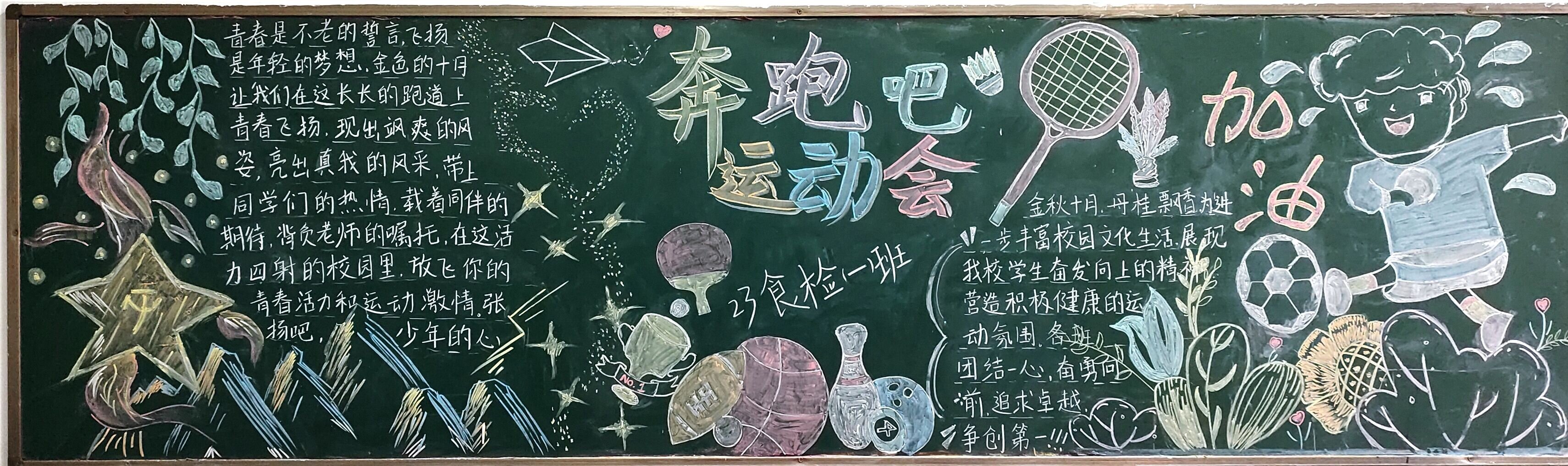 各班同学积极参与到板报的设计中,绘画出他们心中运动会的模样,将自己美好的期待与盼望都在板报中展现出来。板报不仅文字内容丰富深刻,同学们的绘画部分同样显现出了体育精神的具象化表达。板报画出了操场、跑道、运动员、运动标语等,有的同学们挥动着手中的画笔,写上了自己对体育精神的理解;有的同学对着照片,画上了自己喜欢的体育明星;还有的同学挂上一对羽毛球拍,富有创意,以表示对体育的热爱。象征着学生们对运动会的关注与期待。