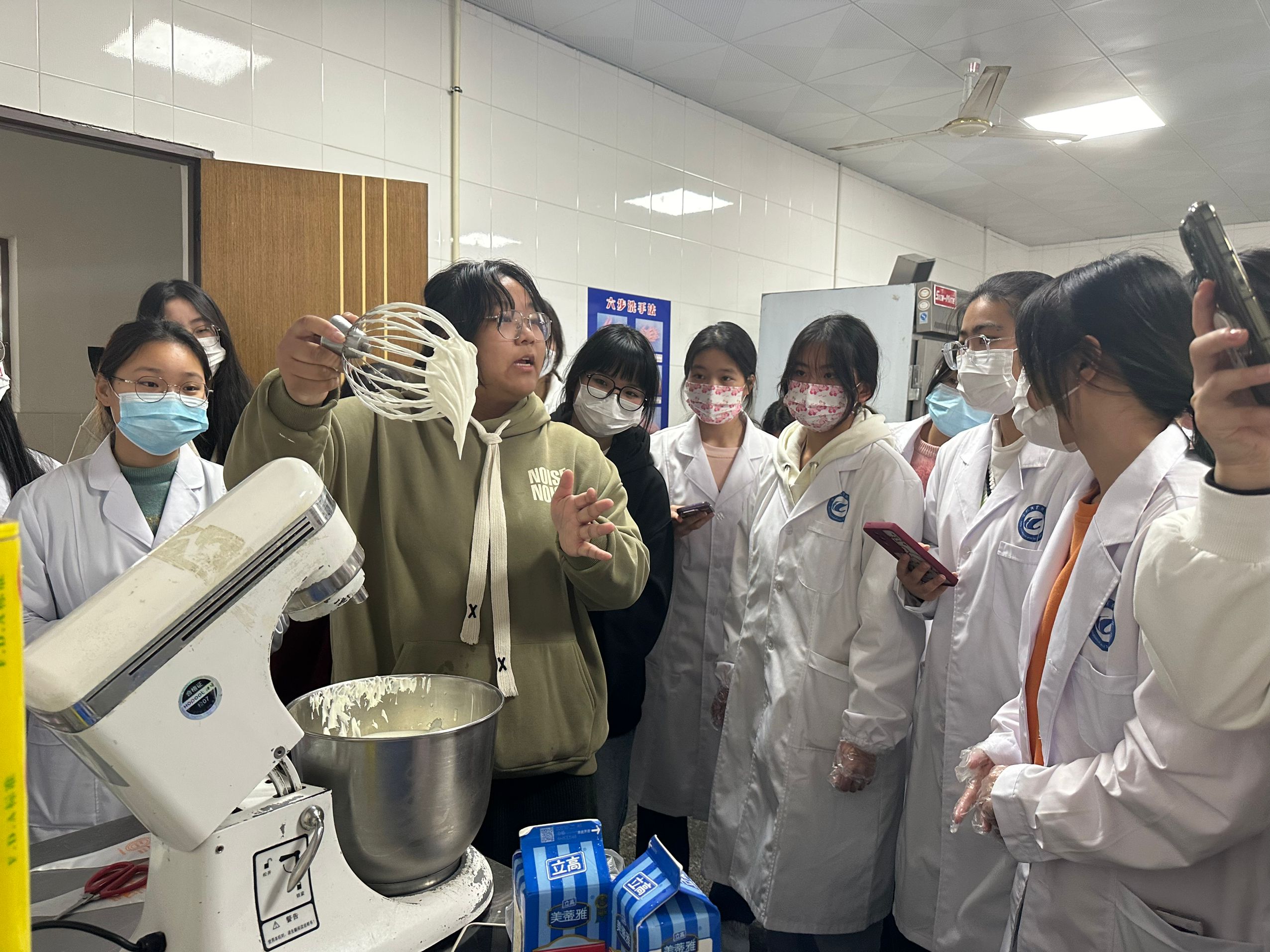 社团指导老师展示奶油的打发、涂抹以及裱花步骤。肖昕与学生们一同制作手工DIY蛋糕,她指出大学生在学习专业课知识的同时也要将其运用于实践,不断提升综合素质。并强调,活动结束要及时清扫台面、带走垃圾,注意个人卫生等。