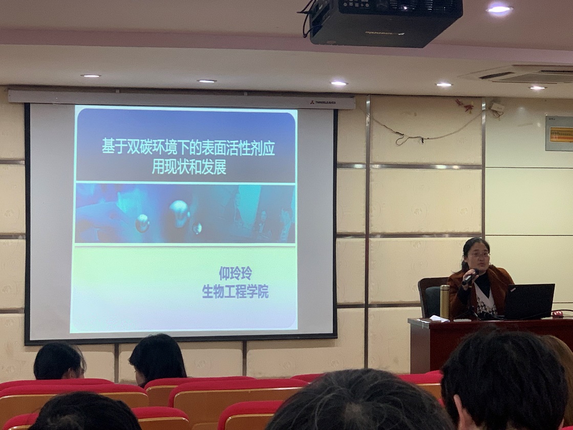 11月22日下午,生物工程学院在鼓山校区图书馆一楼举办题为《基于双碳环境下的表面活性剂应用现状和发展》学术报告会。报告会由食品教研室教师、食品合规管理技能高级考评员——仰玲玲副教授主讲,食品教研室主任郑学斌主持,食品教研室相关专业师生参会。
