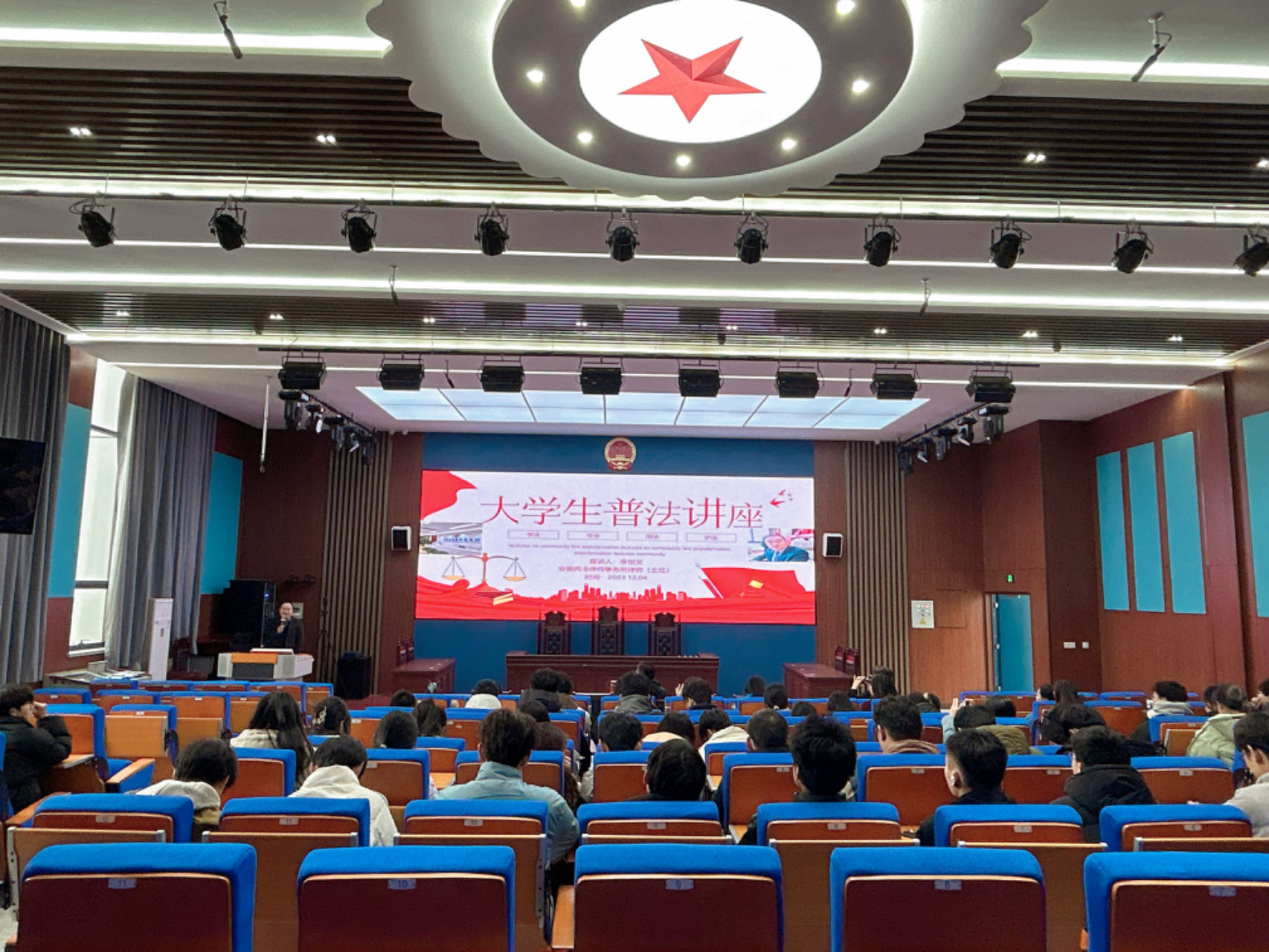 此次活动邀请了安徽两淮律师事务所主任李世文律师进行现场授课,马克思主义学院党支部书记王文飞、院长靳玉琼来到活动现场,全程参与了此次活动。活动由天平法学社指导老师丁丹丹主持,现场约110余人聆听了讲座。