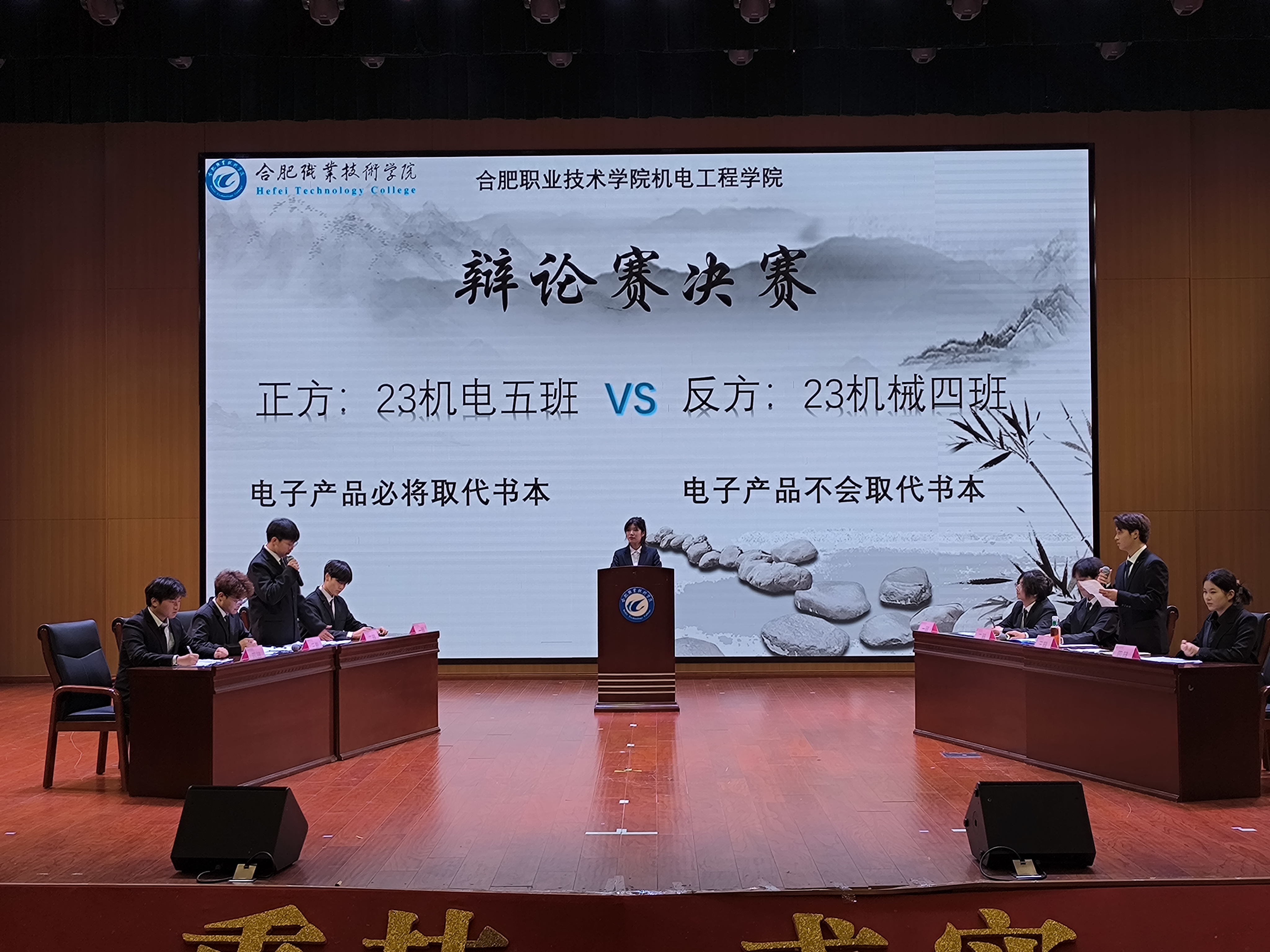 随后出场的是23机电5班与23机械4班,在围绕“电子产品是否会取代书本”的论题中,正反双方的辩手都展现出了自己的风采,其中一方强调了他们的论点,指出了重要的观点,并且以事实和逻辑来支持自己的立场。另一方则以扎实的论据和清晰的逻辑,反驳对方的论点,努力捍卫自己的立场。