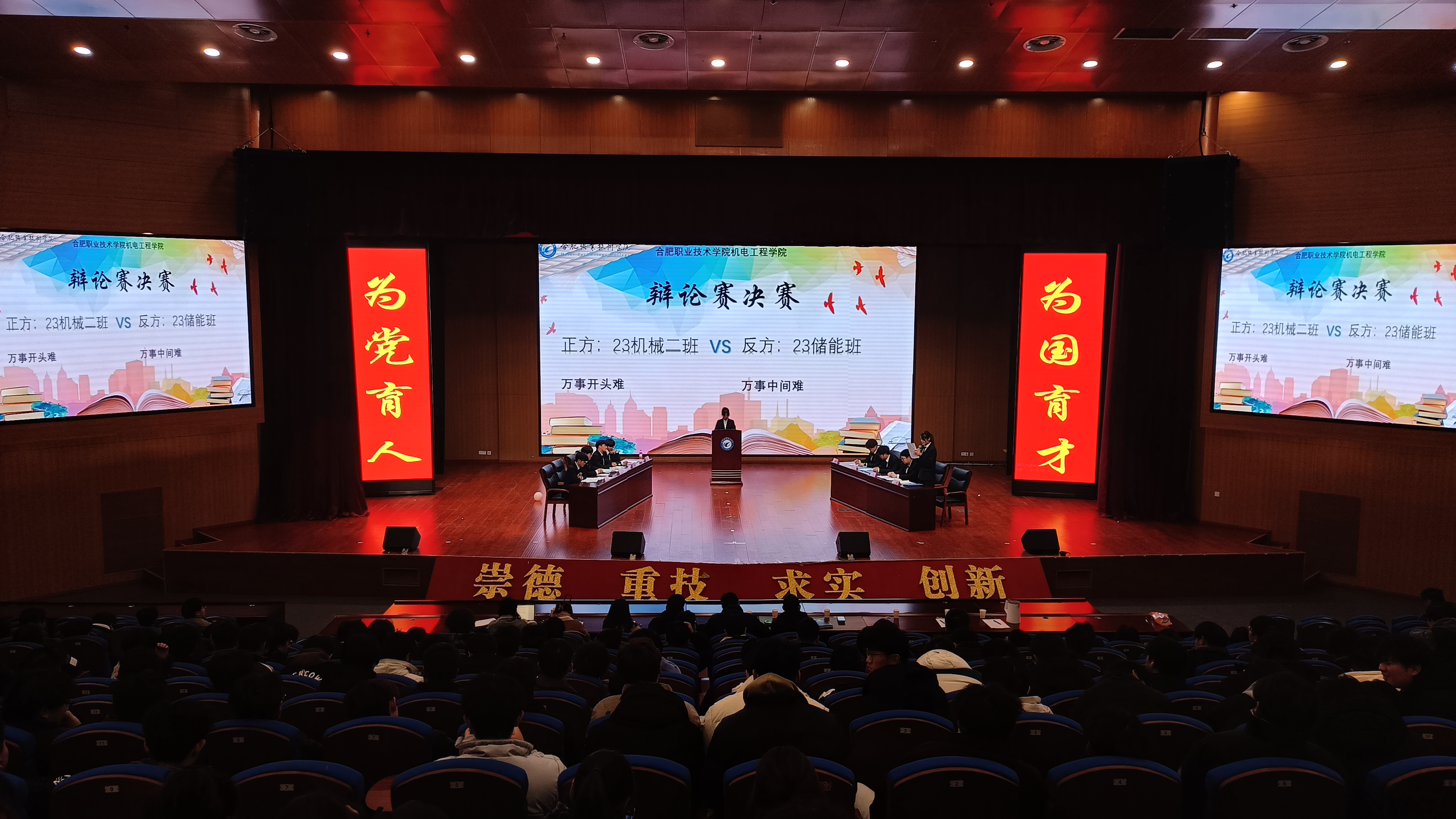决赛分为两场进行,围绕“万事开头难还是中间难”,“电子产品是否会取代书本”两个辩题展开辩论。首先出场的是23储能班与23机械2班,双方辩手都展现出了高超的辩论技巧和深厚的专业知识。这场辩论赛不仅引发了观众的深思,也进一步推动了同学们对做事情有始有终的探讨。比赛中,双方辩手都展示了充分的论据和论证来支持自己的观点,赢得了观众和评委的一致好评。