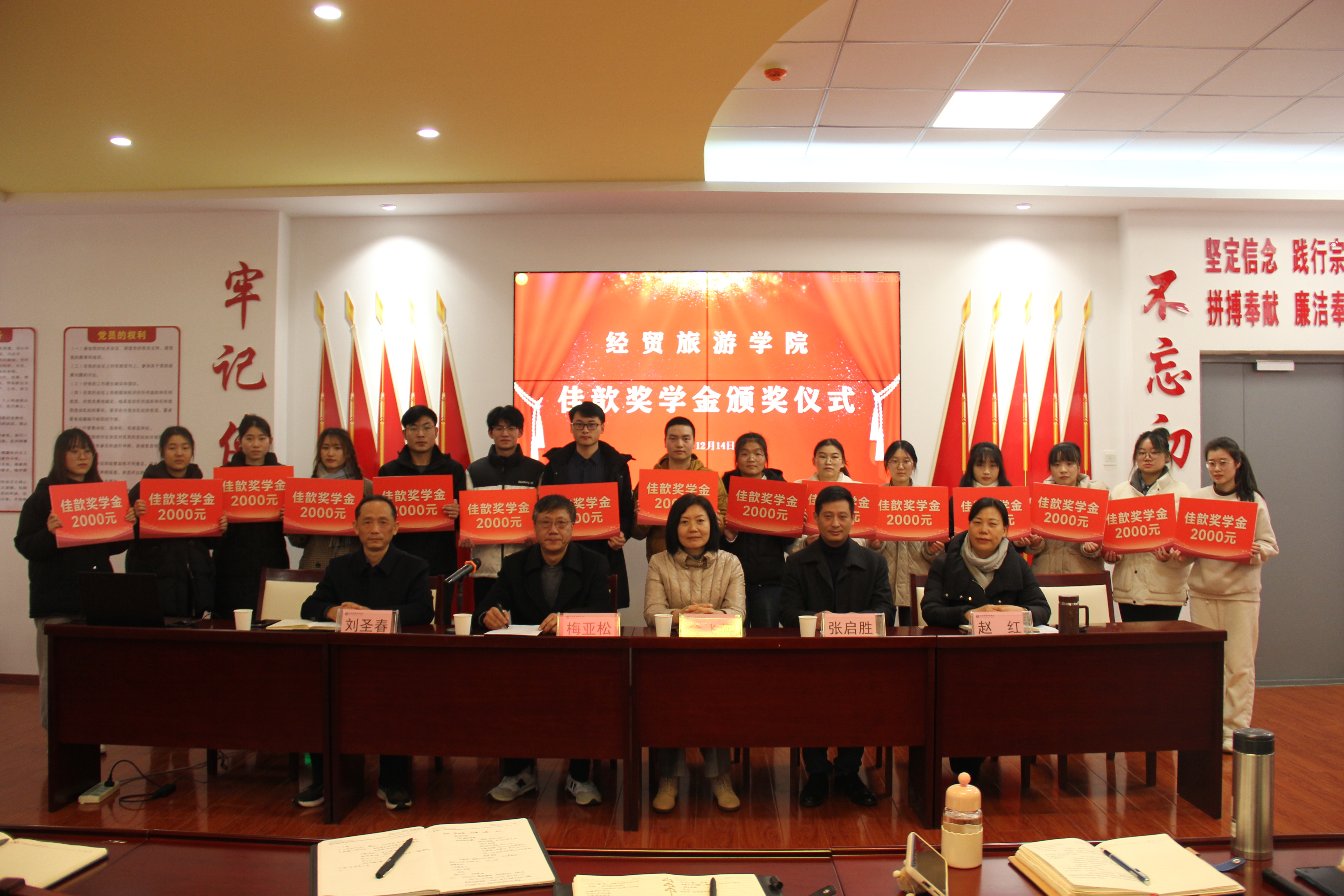 12月14日下午,经贸旅游学院在学院三楼党性体验馆举行2023年“佳歆”奖学金颁奖仪式。校党委副书记金飞燕、上海佳歆房地产投资顾问有限公司董事长张启胜、学院党政领导班子、学院学管办全体辅导员、全体获奖学生和部分学生代表参加了此次颁奖仪式。颁奖仪式由学院党总支书记梅亚松主持。