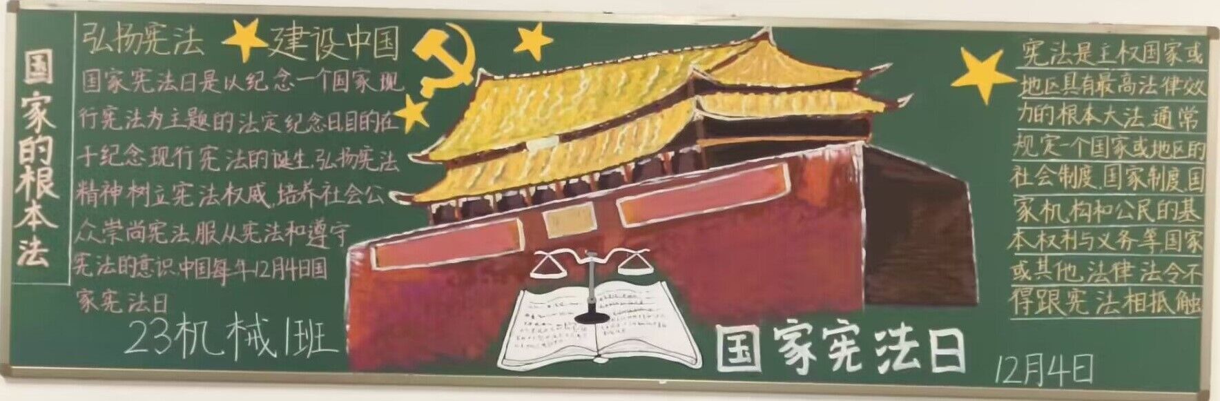 今年12月1日至12月7日为宪法宣传周活动时间,12月4日是第十个“国家宪法日”。为深入学习贯彻党的二十大精神,全面贯彻落实习近平法治思想和习近平文化思想,进一步弘扬宪法精神,维护宪法权威,增强学生的法治意识和遵纪守法的自觉性,机电工程学院举办了一场以“大力弘扬宪法精神,建设社会主义法治文化”为主题的黑板报线上评比活动。
