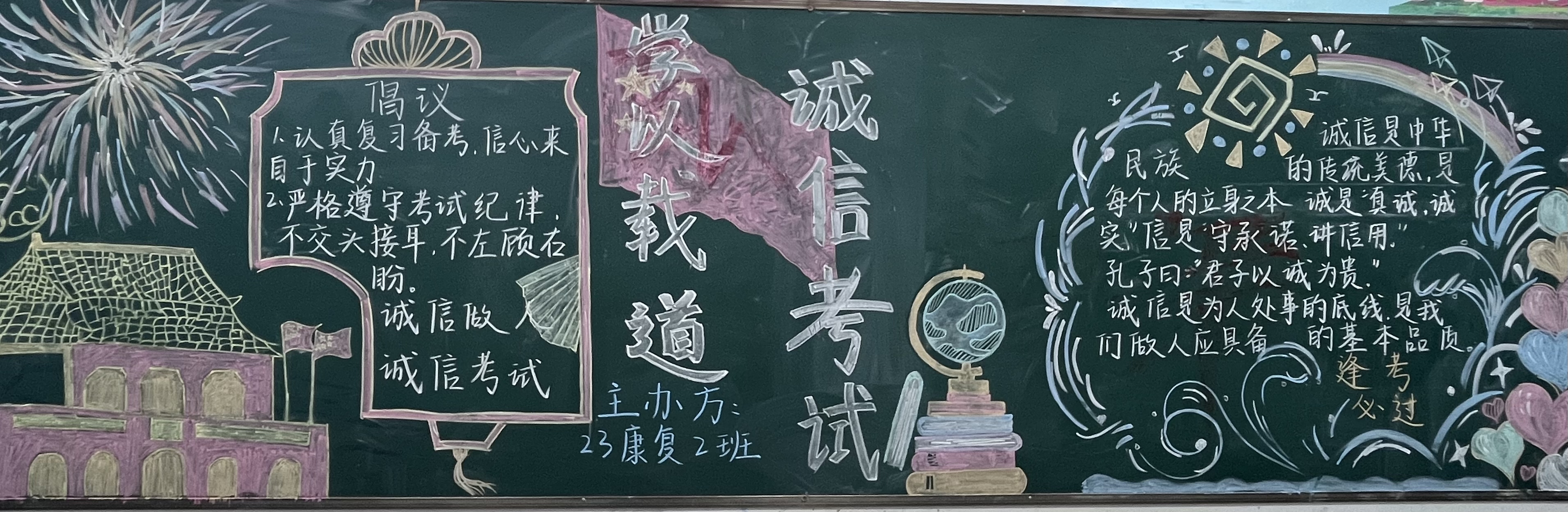 本次黑板报活动中,各班级同学积极参与,紧扣本次“诚信”主题,通过多种元素、绘画材料呈现出精彩的黑板报作品。展现了同学们对于诚信的理解,并发出倡议:认真复习备考、严格遵守考试记录、诚信做人、诚信考试。