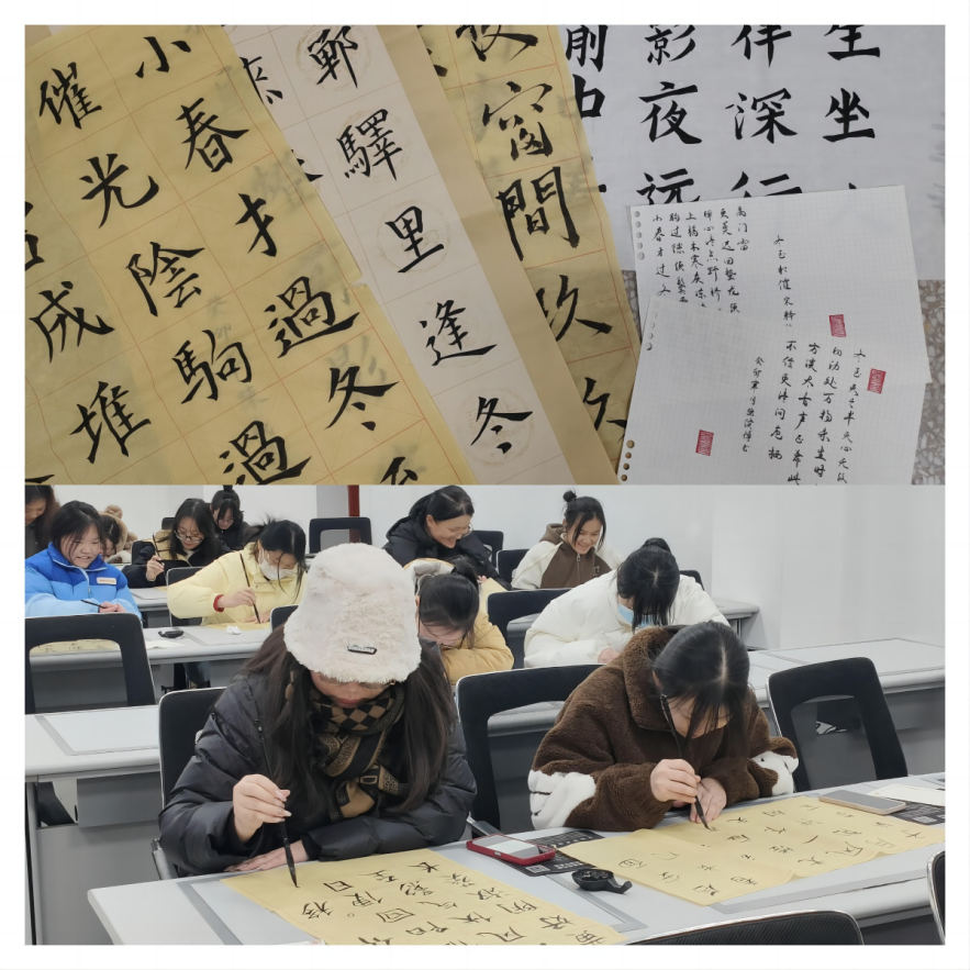 以手写心,以字传情。同学们轻轻铺开纸张,吸满墨汁,屏气凝神的书写每一个字,有潇洒的行书,有娟秀的楷书,还有簪花小字,一笔一画都表达着迎接冬至的愉悦。