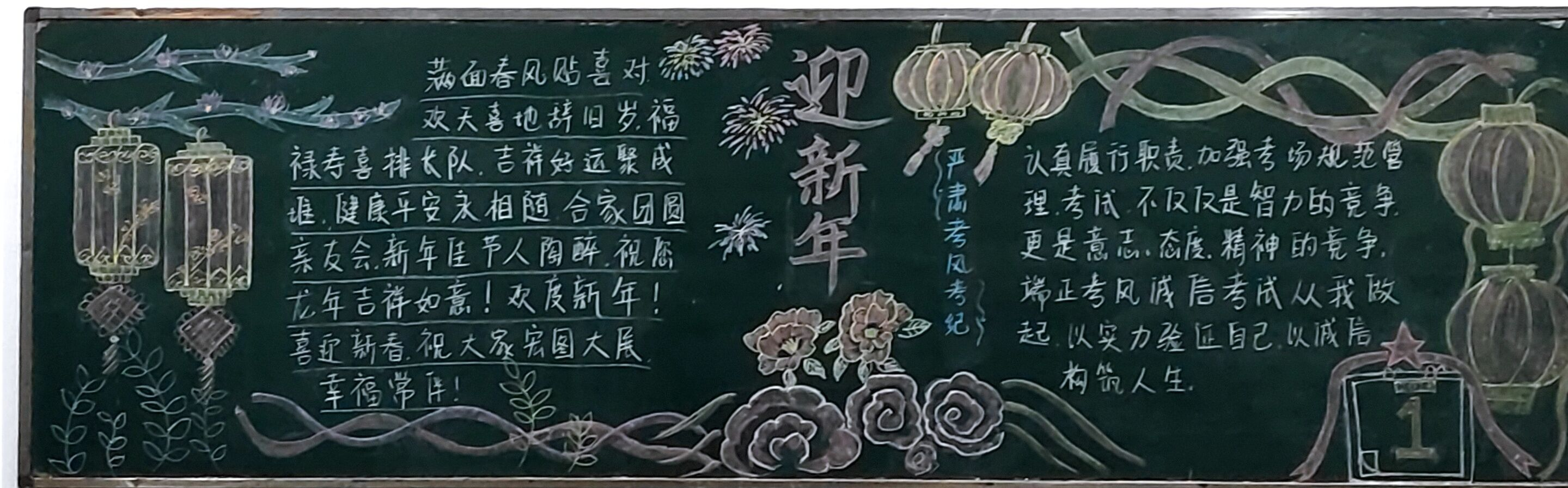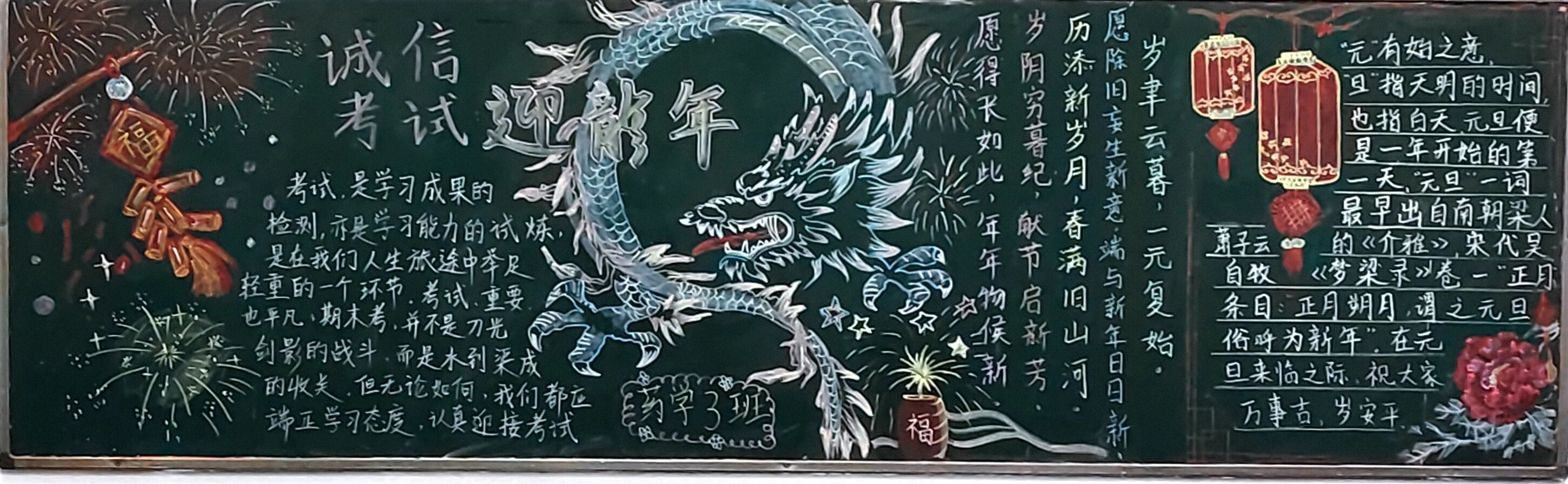 通过同学们辛苦积极的创作,板报内容丰富多彩。既展现了同学们对新年新气象的展望,也表现出对考试规则严格遵守的态度。板报中栩栩如生的龙,正如同学们一样龙图大展。在同学们画的鞭炮与烟花中,看到了璀璨夺目的大学生活。内容更能表达出同学们对期末考试的信心满满,正如同学们所说,诚信乃安身立命之本。