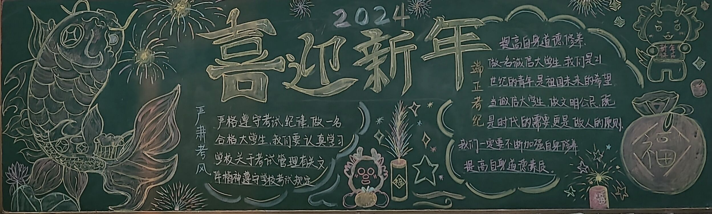 为迎接2024年,备战期末考试,严肃考风考纪,培养良好的校风和学习氛围,生物工程学院团总支组织生物工程学院全体同学积极参加以“迎新年 正考风”为主题的黑板报活动。