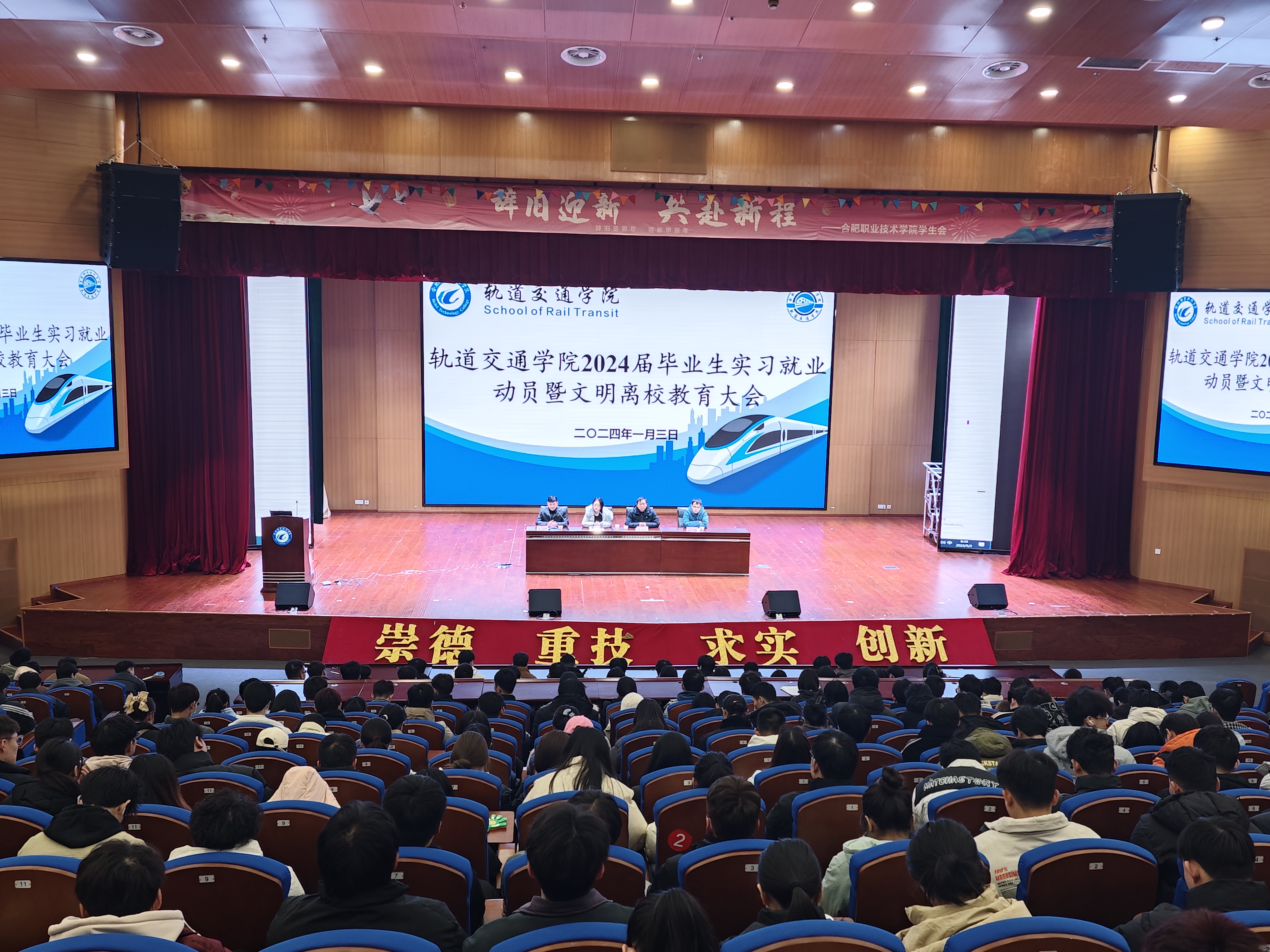 为进一步做好2024届毕业生实习就业及离校期间安全工作,1月3日下午,轨道交通学院于汇心湖校区大学生活动中心召开2024届毕业生实习就业动员暨文明离校教育大会。轨道交通学院党政领导、毕业班辅导员及2024届全体毕业生参加会议。会议由副院长劳志鸿主持。