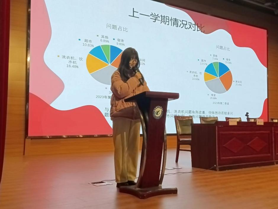 随后,鼓山校区学生会李雯同学就QQ权益反馈群反馈的问题及本学期鼓山校区学生会权益部发放的问卷调查结果进行总结汇报。整场汇报通过数据图表的方式呈现出学生最关心的问题,让现场参与人员更加全面、直观地感受到学生的诉求。