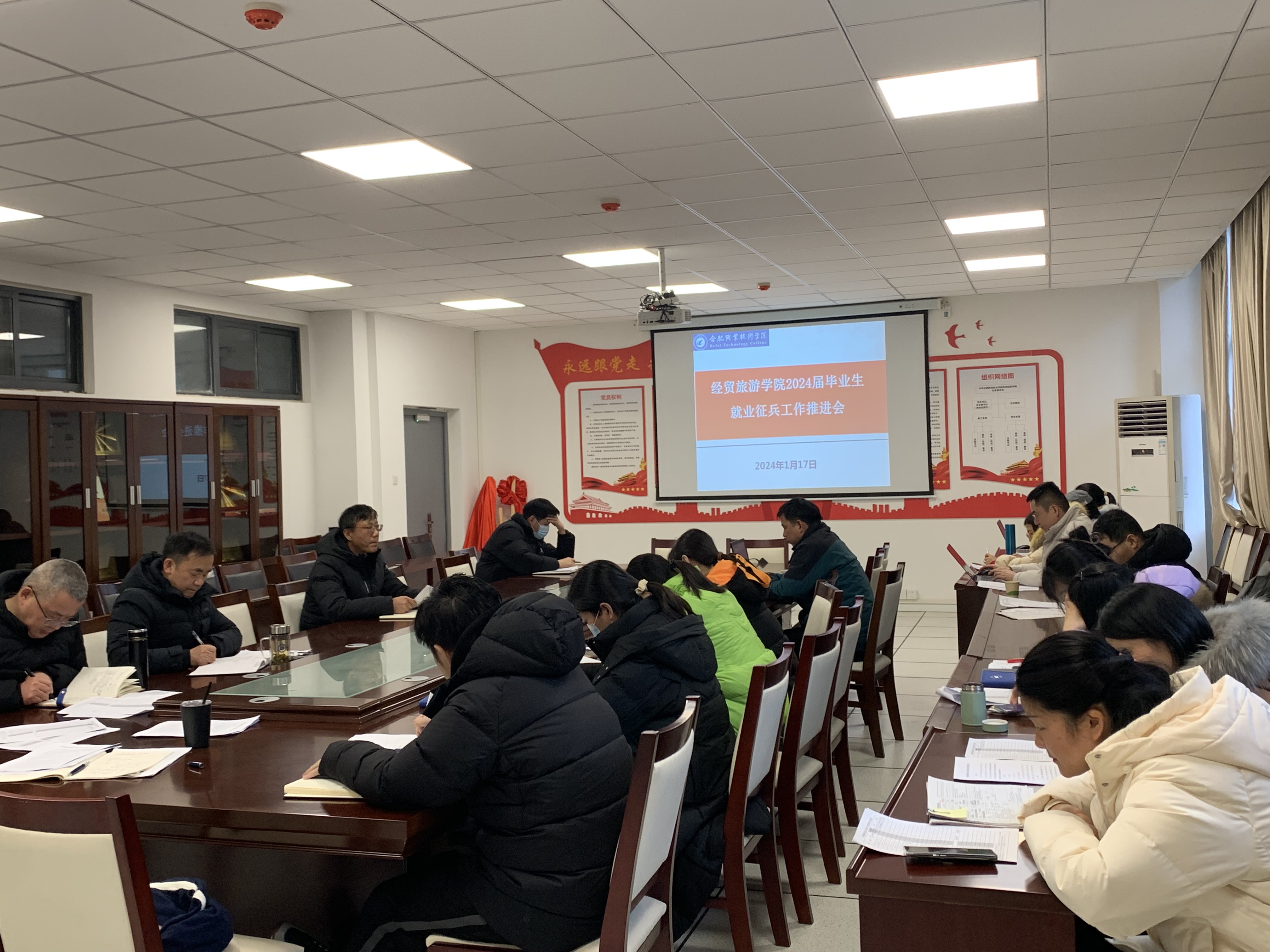 1月17日下午,经贸旅游学院在经贸楼党员会议室召开2024届毕业生就业征兵工作推进会,学院党总支书记梅亚松、副院长陈继林、综合办主任高荣明、各教研室主任、全体2024届毕业班辅导员等老师参加此次会议。
