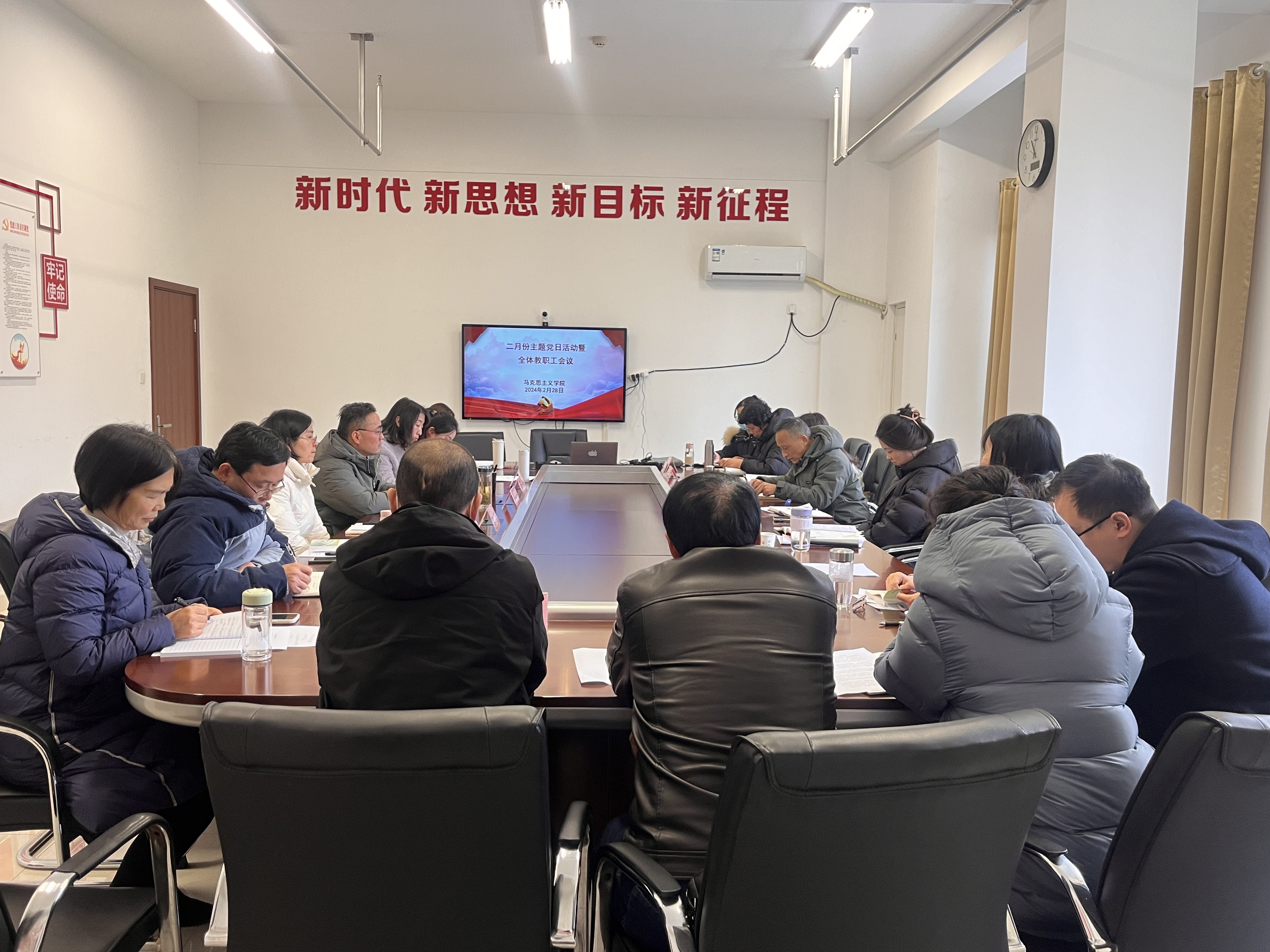 为深入落实立德树人根本任务,理清新学期工作思路,进一步提高思政课教学质量,2月28日上午,马克思主义学院召开了二月份主题党日活动暨全体教职工会议。学院党支部书记王文飞、院长胡心红和全体教职工参加了会议,会议由王文飞主持。