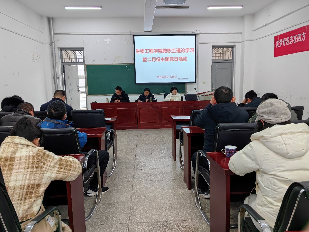 为巩固深化学习贯彻习近平新时代中国特色社会主义思想主题教育,保障新学期开学工作稳定有序开展,根据学校党委安排部署,2月28日下午,生物工程学院在生化楼A305开展了教职工理论学习暨二月份主题党日活动。会议由党总支副书记(主持工作)慈龙保主持,全体教职工参加会议。