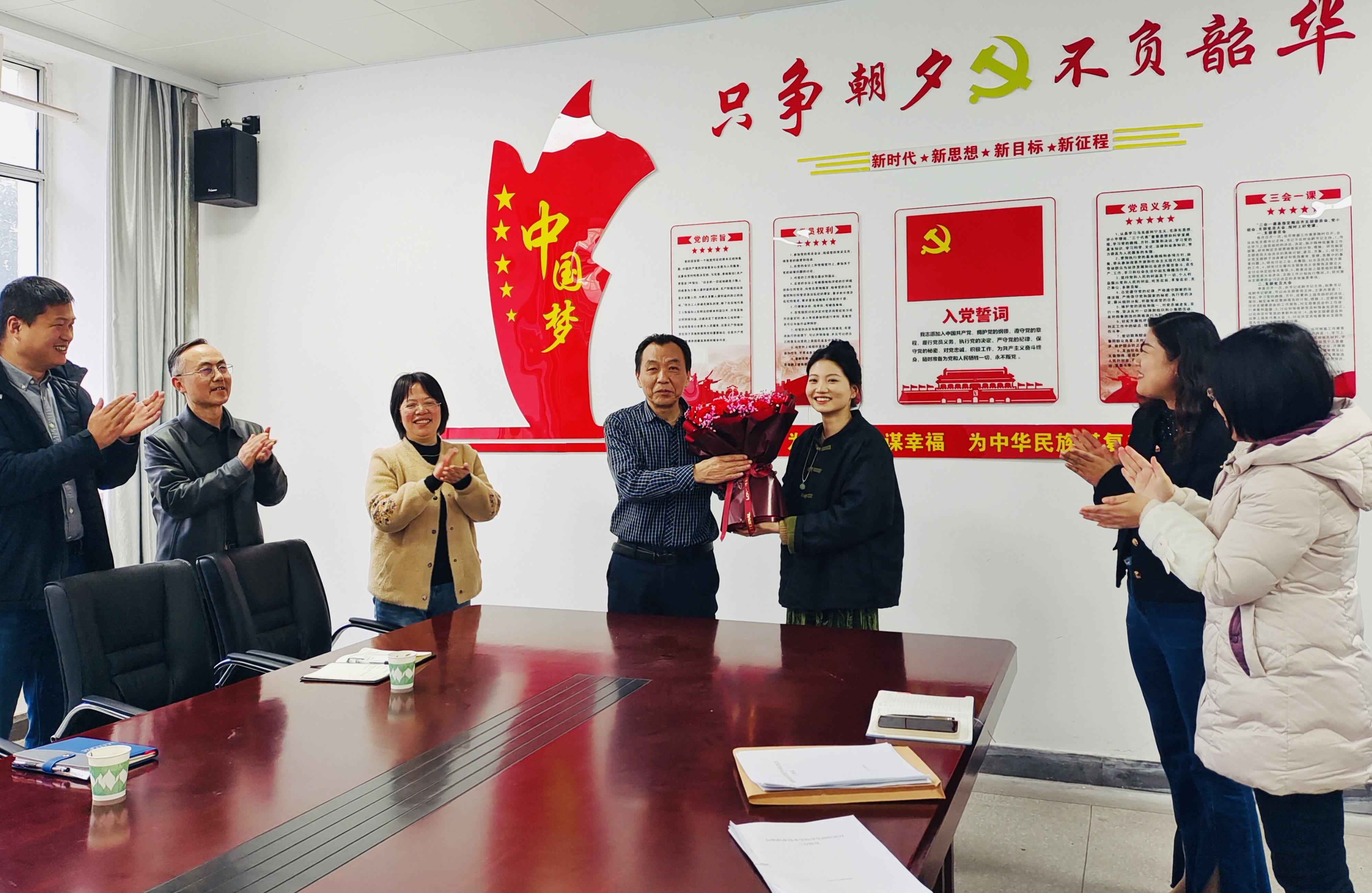 宁业群结合自己的工作经历,深情回顾了与大家共事的岁月故事和学院工作的珍贵回忆,对学院贴心的安排、同志们一直以来的支持和配合表示感谢,表达了对学院的满腔热爱和美好祝福。在大家的掌声中,青年教师昌逸文为宁书记送上祝福的鲜花,气氛热烈而温馨。