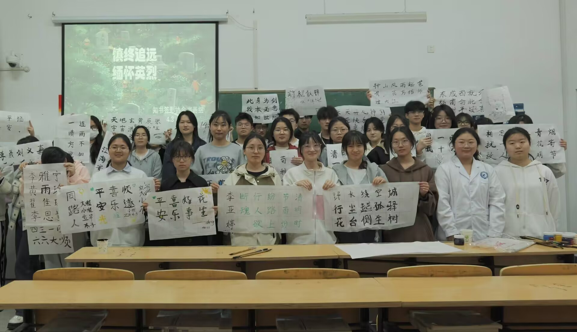 清明暮春里,先烈万古存,4月3日下午,医学院知书答影协会的同学们在教学楼开展了“慎终追远,缅怀英烈”书法创作活动。同学们执起毛笔,写下与清明有关的诗句,在书写过程中,体会中国古代历史文化的厚重,同时缅怀革命先烈,厚植爱国情怀,感受“为有牺牲多壮志,敢教日月换新天”的奋勇与担当。墨香阵阵,同学们在留校的假期里共同感受清明特有的文化氛围。