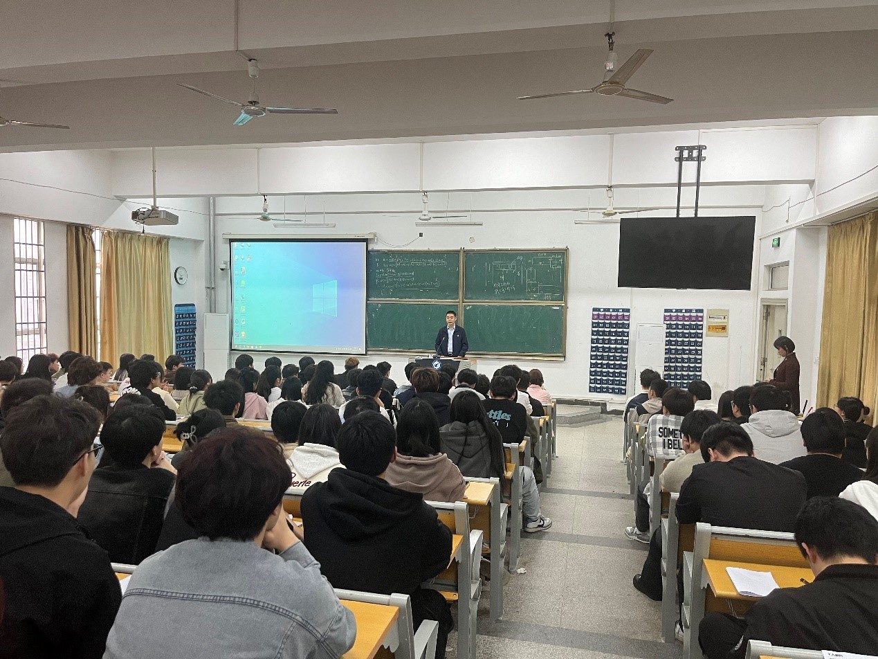 该公司党委组织部(人力资源部)主任王辉、主任科员沙从阳向同学们进行了招聘宣讲。王辉通过播放宣传纪录片等方式详细介绍了公司历史、企业文化、工作内容和办公环境等,让同学们从多个方面了解公司。