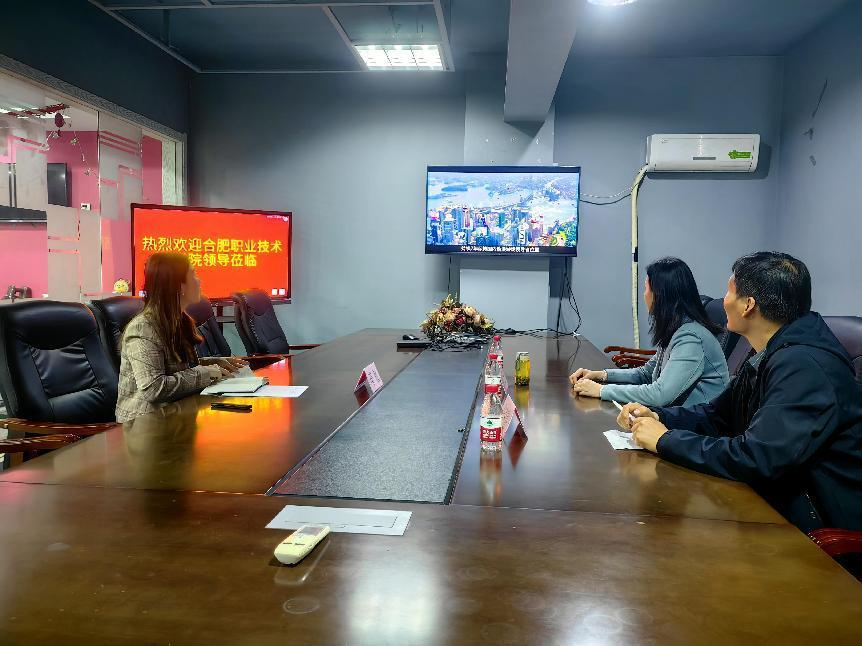 在合肥虚拟现实信息技术有限公司,校方首先了解了学院往届毕业生在单位的工作情况,接着双方就学生实习、就业的用人需求、虚拟仿真项目、课程建设、教学资源库建设展开了深入的交流。