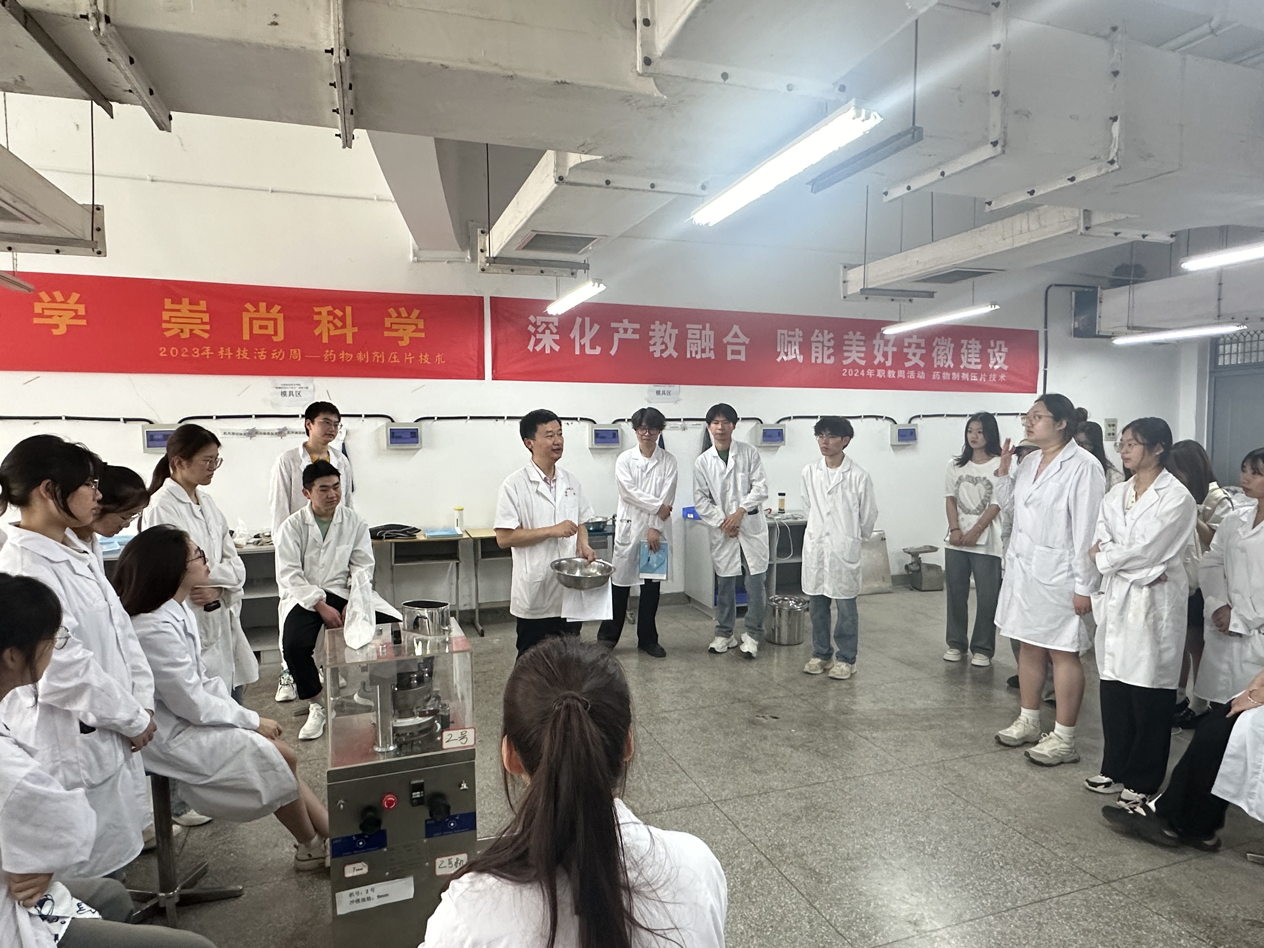 为贯彻落实“深化产教融合,赋能美好安徽建设”职教周主题精神,5月22日下午,生物工程学院在鼓山校区药物制剂实训中心开展“药物制剂压片技术”科普体验活动。本次活动集中展示现代制药技术和制药设备,涉及模拟药品生产企业的片剂岗位、胶囊制备岗位和包衣岗位及其关键设备旋转压片机、全自动胶囊填充机及片剂高效包衣机等实操内容。生物工程学院第一党支部范高福工作室“双带头人”范高福、韦梦强两位老师担任讲解员,接待校内园林类专业、食品类专业及其他专业参观人员80余人次。