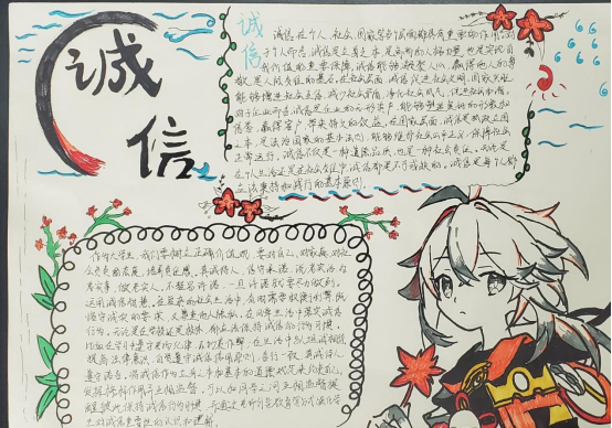 活动期间,同学们积极响应,纷纷投稿。每一幅手抄报都凝聚了他们的心血和智慧,通过文字、图画、色彩等多种元素,作品生动形象地展现了他们对诚信美好品质的理解和尊重。这些作品不仅展示了学生们的艺术才华,更体现了他们对诚信品质的深刻认识和真挚追求。