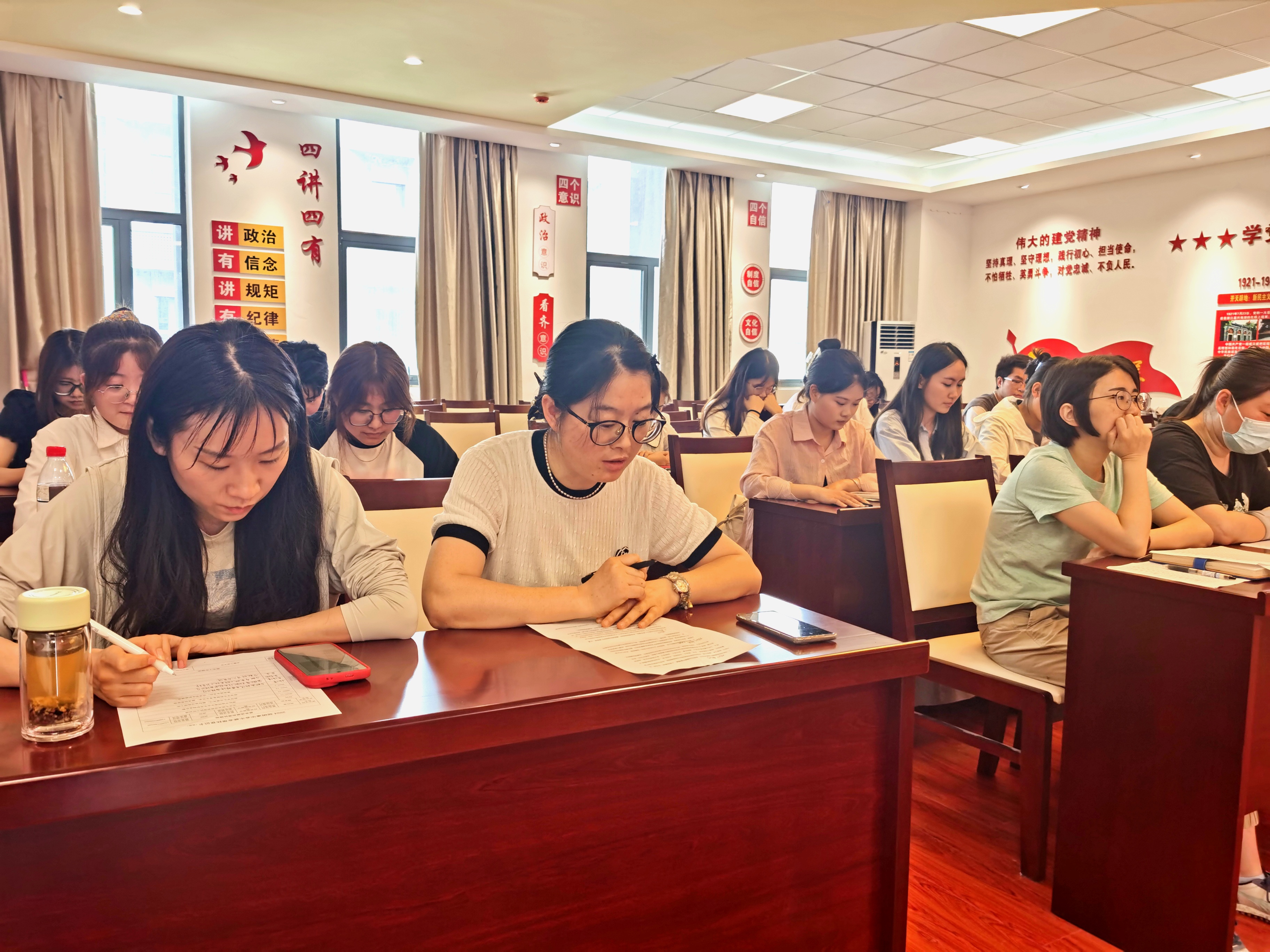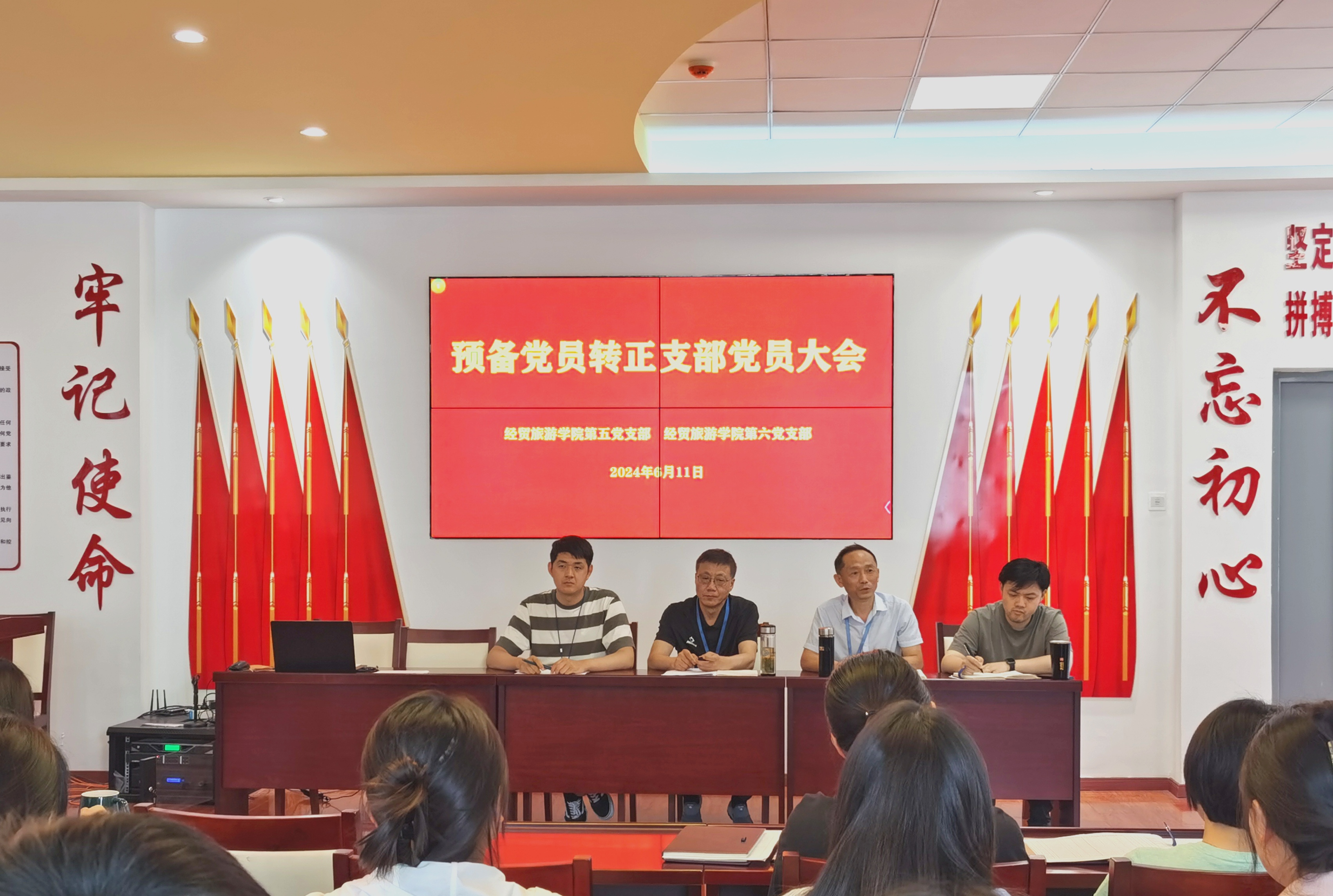 6月11日下午,经贸旅游学院第五党支部、第六党支部在经贸楼三楼党性体验馆分别召开党员大会,讨论罗元航等30名预备党员的转正事宜。大会由王明明同志主持,两个支部的全体党员参加了大会。