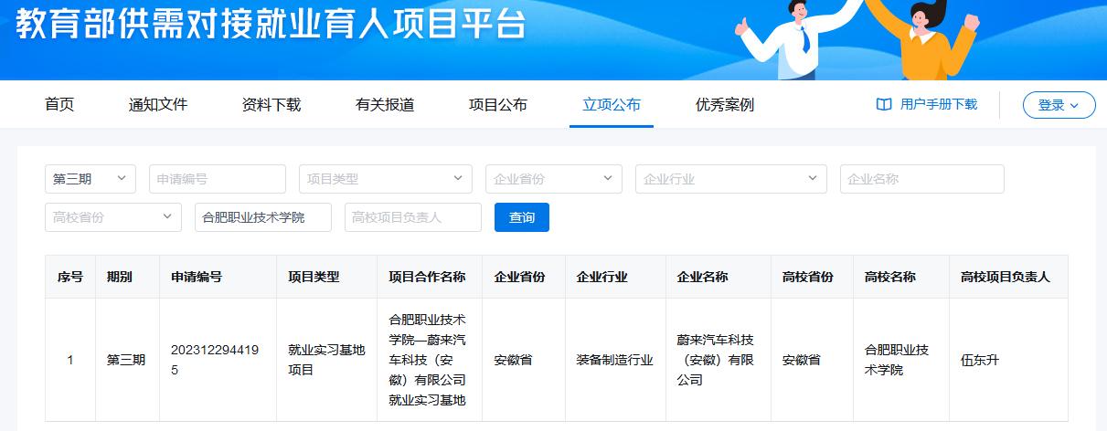 6月14日,教育部公布了第三期供需对接就业育人项目立项名单。由学校与蔚来汽车科技(安徽)有限公司共同申报的项目:Beat365唯一官方网站—蔚来汽车科技(安徽)有限公司就业实习基地成功立项。