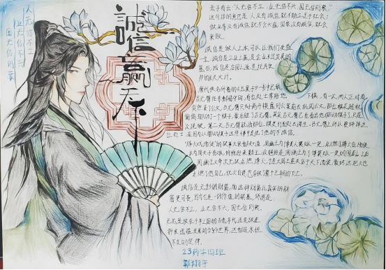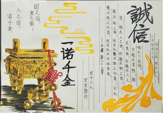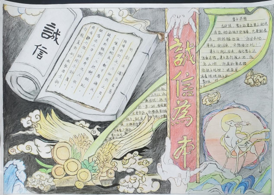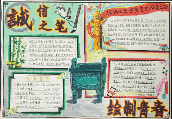“诚信之笔,绘制青春”诚信手抄报大赛。同学们积极投稿,用文字、图画、色彩等元素展现了对诚信的深刻理解和尊重。这些作品不仅展示了学生的艺术才华,更体现了他们对诚信品质的执着追求。