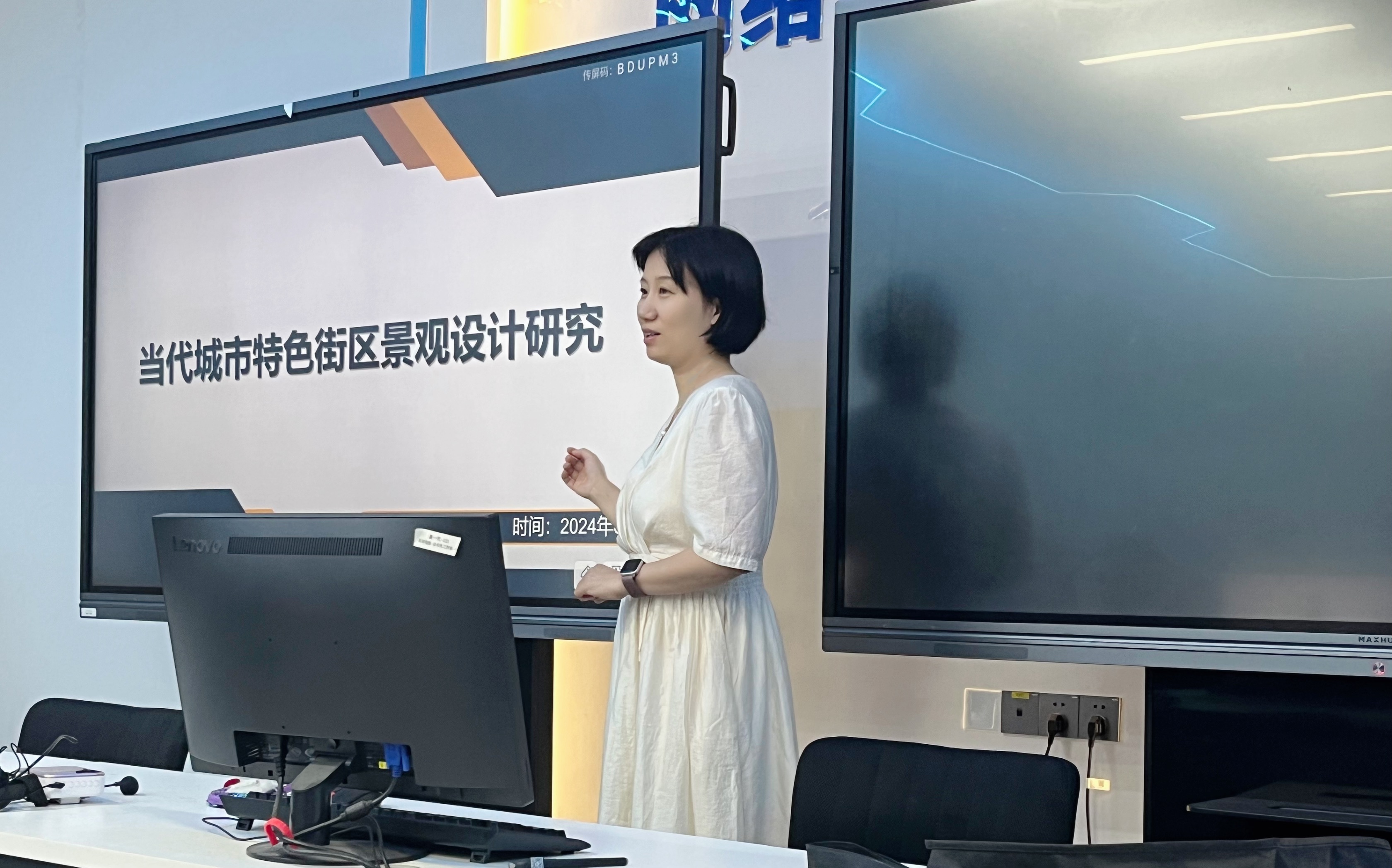 最后,许雁翎老师还以合肥市特色街区景观设计的研究实践为例,从文化元素提炼、空间布局创新、材质选用角度等方面为教师的科研课题思路、学生设计选题提供指引。