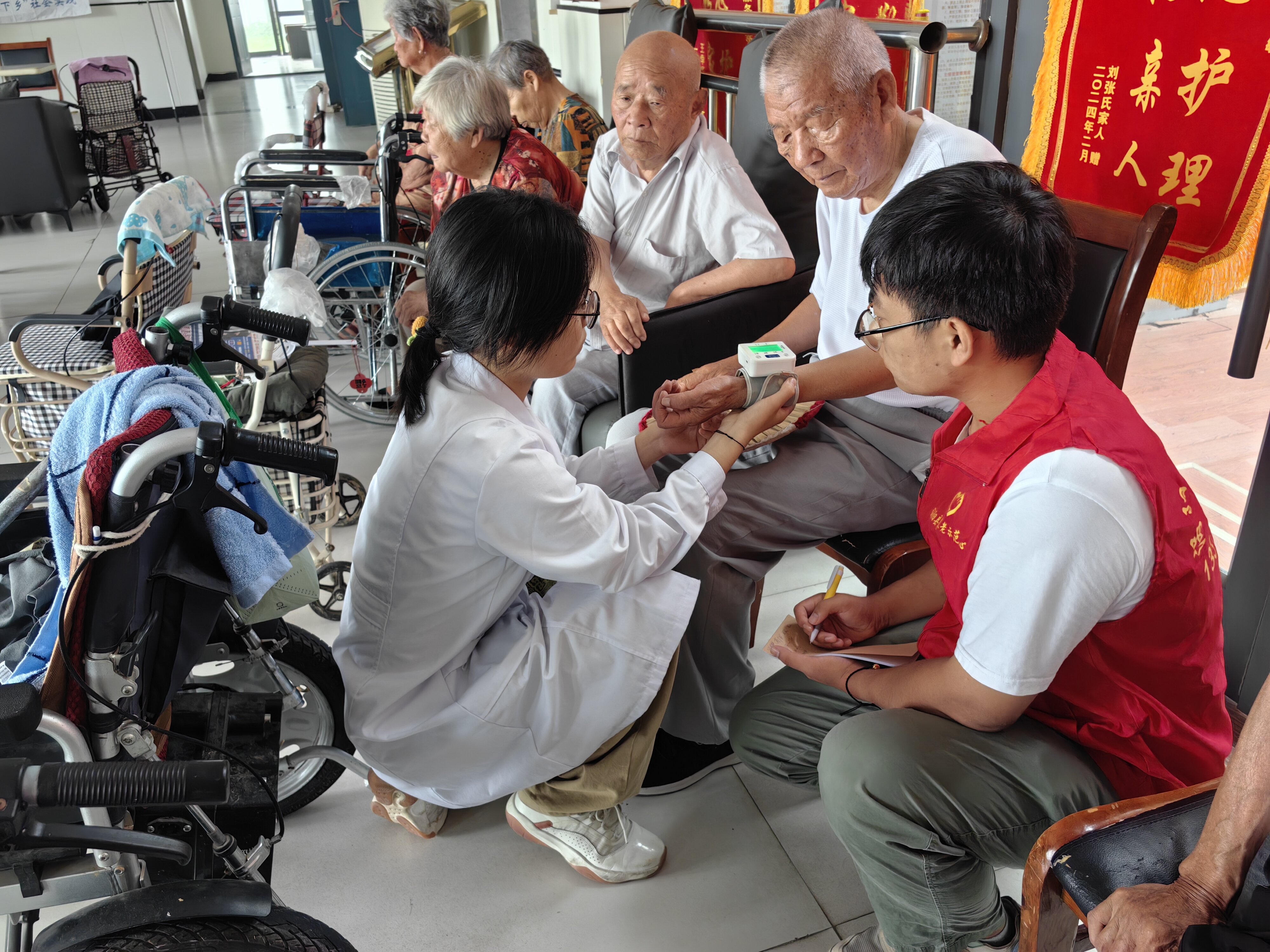紧接着,“合心筑梦”团队的同学们来到了涡阳县养老示范中心,开展了一系列丰富多彩的义诊与健康宣教活动。一踏入养老示范中心,团队成员们便迅速投入到了紧张而有序的工作中。他们不仅为老人们进行了全面的健康评估,包括血压、血糖等项目的检测,还针对每位老人的健康状况,提供了个性化的饮食建议和生活方式指导。此外,团队成员为表达对老人们的关怀,还向老人们赠送了牛奶、水果等食物。在这几天的实践中,团队累计为83名老人提供了健康服务。他们不仅耐心解答了老人们的各种健康疑问,还通过轻松愉快的互动环节,如健康知识问答、医学科普等活动,极大地调动了老人们的参与热情,使得健康宣教活动既实用又富有趣味性。