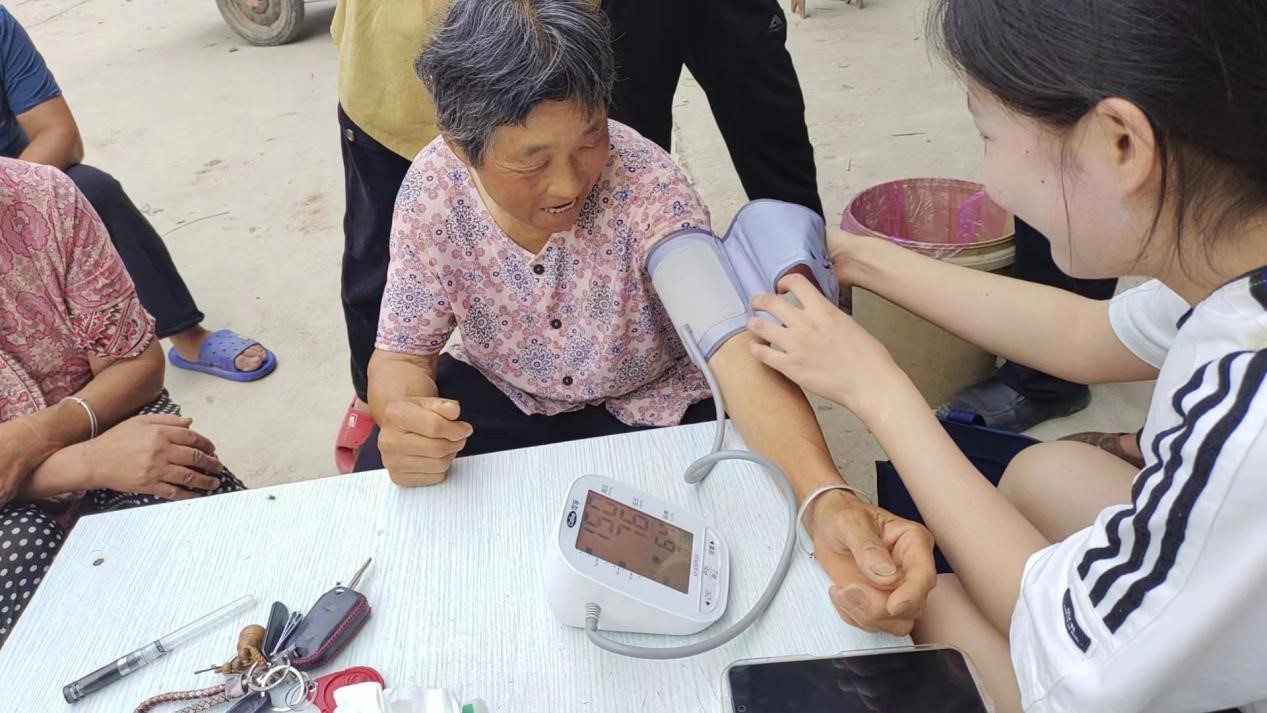 同学们携带专业设备,对太山村的卫生医疗情况进行了深入的走访调查,并为每一户村民进行了血压和血糖测量。看似简单的测量工作,却让大家深刻体会到了推进乡村医疗建设的不易。测量过程中,同学们发现患无症状高血压的村民对自身健康重视严重不足,认为无症状就是健康的表现,经过师生的反复宣传,才终于意识到自己的身体状况。也有村民反映日常用药后高血压得不到很好的控制或副作用较大,同学们都根据他们所说的情况,针对性检查药物,提出相应的换药和配合治疗的建议方案。为了保证血糖测量的精准度,实践队成员在检查的前一天晚上逐个打电话告知村民次日空腹测量的相关事宜。测量结果出来后,又贴心的为需要治疗的村民写好小便签,便于村民前往卫生院进行进一步检查和购买药物。