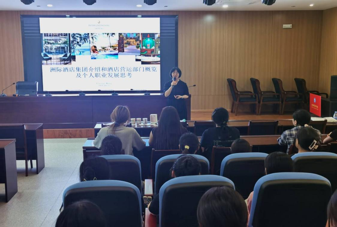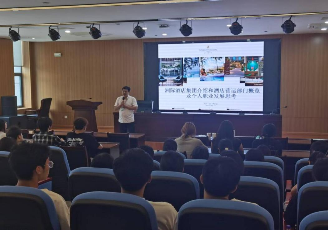 在图书馆一楼报告厅,2024级酒店管理与数字化运营专业的新生入学教育,分为”洲际酒店集团和酒店运营其个人职业发展思考”的专题讲座和专业介绍两个部分开展。洲际酒店高管王晓洁介绍了世界一流品牌酒店集团——洲际酒店在中国的发展历程、发展规模、洲际酒店集团运营的模式、个人职业选择及洲际酒店集团人才发展成长路径等方面的情况,专业负责人杨世河教授对酒店管理与数字化运营专业的教学情况、取得的成绩及主要特色作了详细讲解,学生们听得认真,现场互动氛围十分热烈。