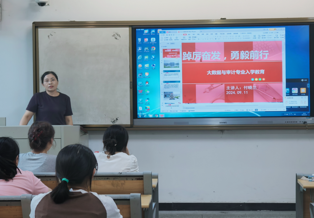 9月11日下午,经贸旅游学院付晓兰教授在汇心湖校区南教学楼101教室组织开展了名为“踔厉奋发,勇毅前行”的2024级大数据与审计专业新生入学教育专题讲座。