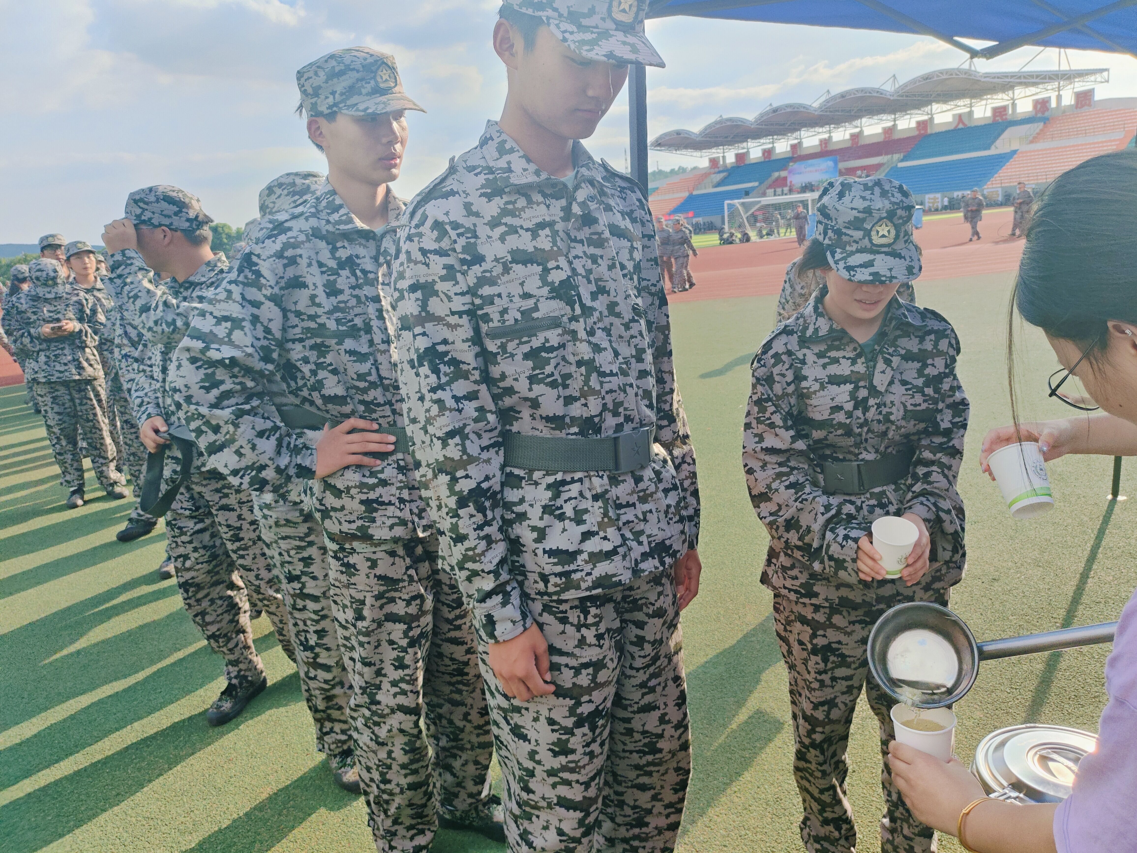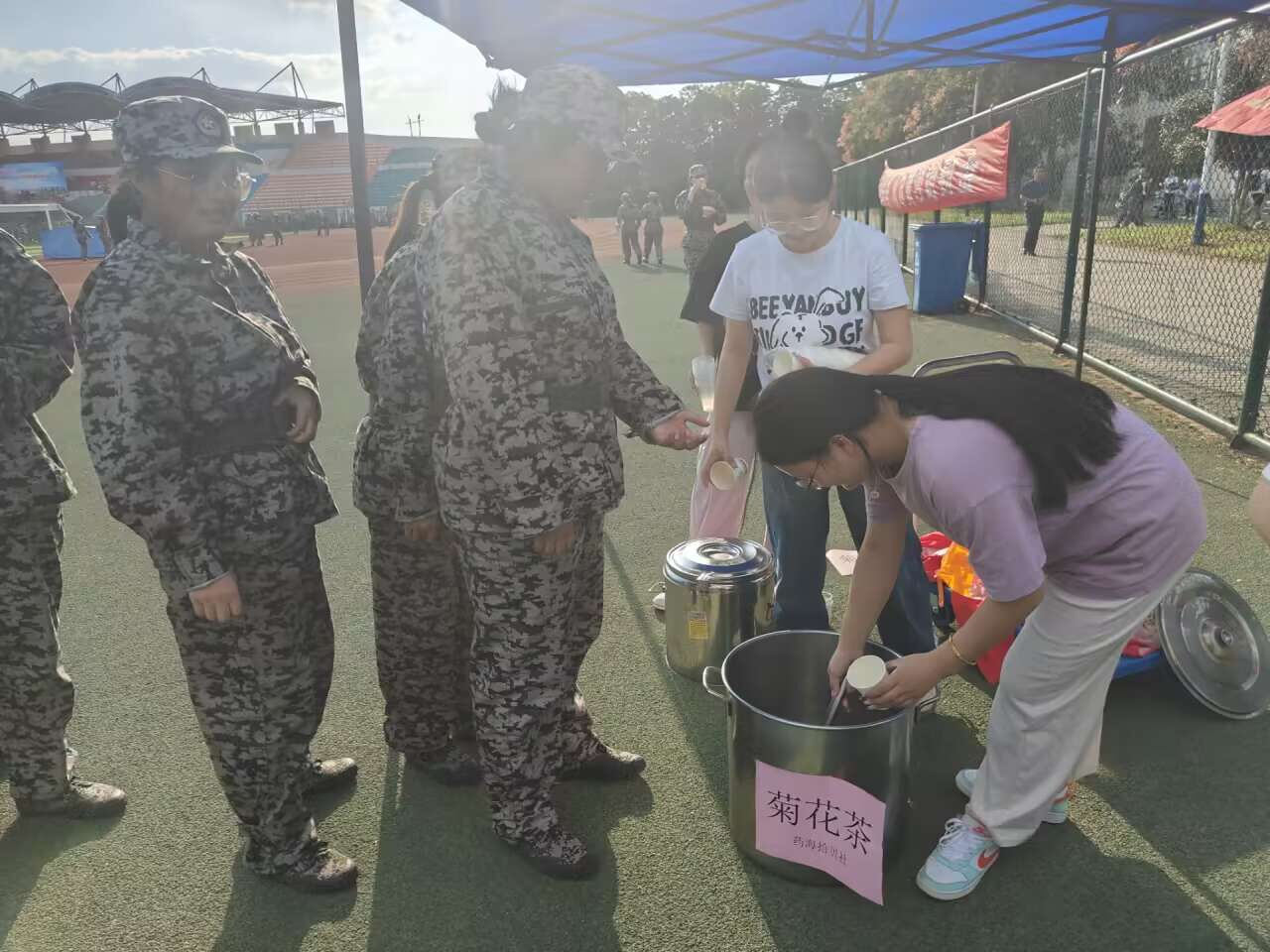 当天下午,药海拾贝社的成员早早来到了活动室,开始了菊花茶的制作,清洗冲泡完成之后,志愿者们将菊花茶搬运到训练场,并且有序开展分发菊花茶行动。一位刚刚下训的新生接过茶杯,露出了惊喜的表情:“真的太贴心了,谢谢你们!”一位教官则感慨地说:“这茶喝下去,感觉整个人都清爽起来了。”这些简单的互动和反馈,让志愿者们感受到了付出的快乐和意义。