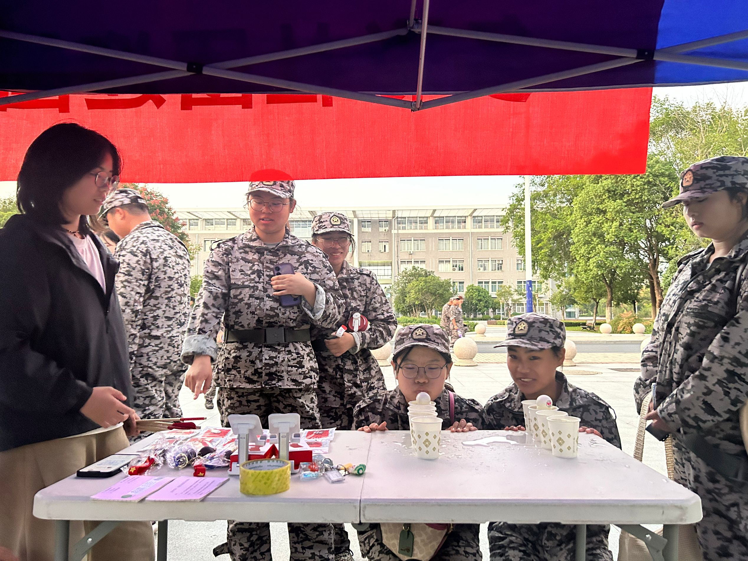 搭帐篷、拉横幅、摆道具,活动开始前,相关社团早早就布置好活动场地和用品。待到活动时间临近,越来越多的同学集中过来,准备在自己感兴趣的项目中一展身手。傍晚时分,鼓山校区一食堂前广场充满了同学们的欢声笑语。