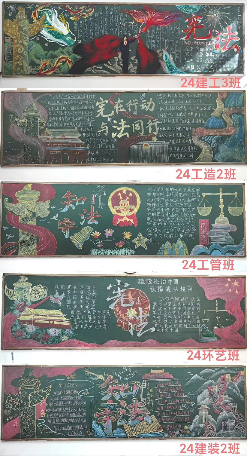 各在校班级积极参与,同学们充分发挥自己的创意和才华,以图文并茂的形式展示了宪法的基本内容、产生背景、发展历程以及宪法精神的重要性。大家还围绕宪法精神自主设计,结合自己的生活实际,创作出了一幅幅富有创意和感染力的黑板报作品,不仅充分展现了宪法的庄严与神圣,更激发了同学们学习宪法、尊重宪法的热情。经评选,24建工3班等6个班级分获一、二、三等奖。