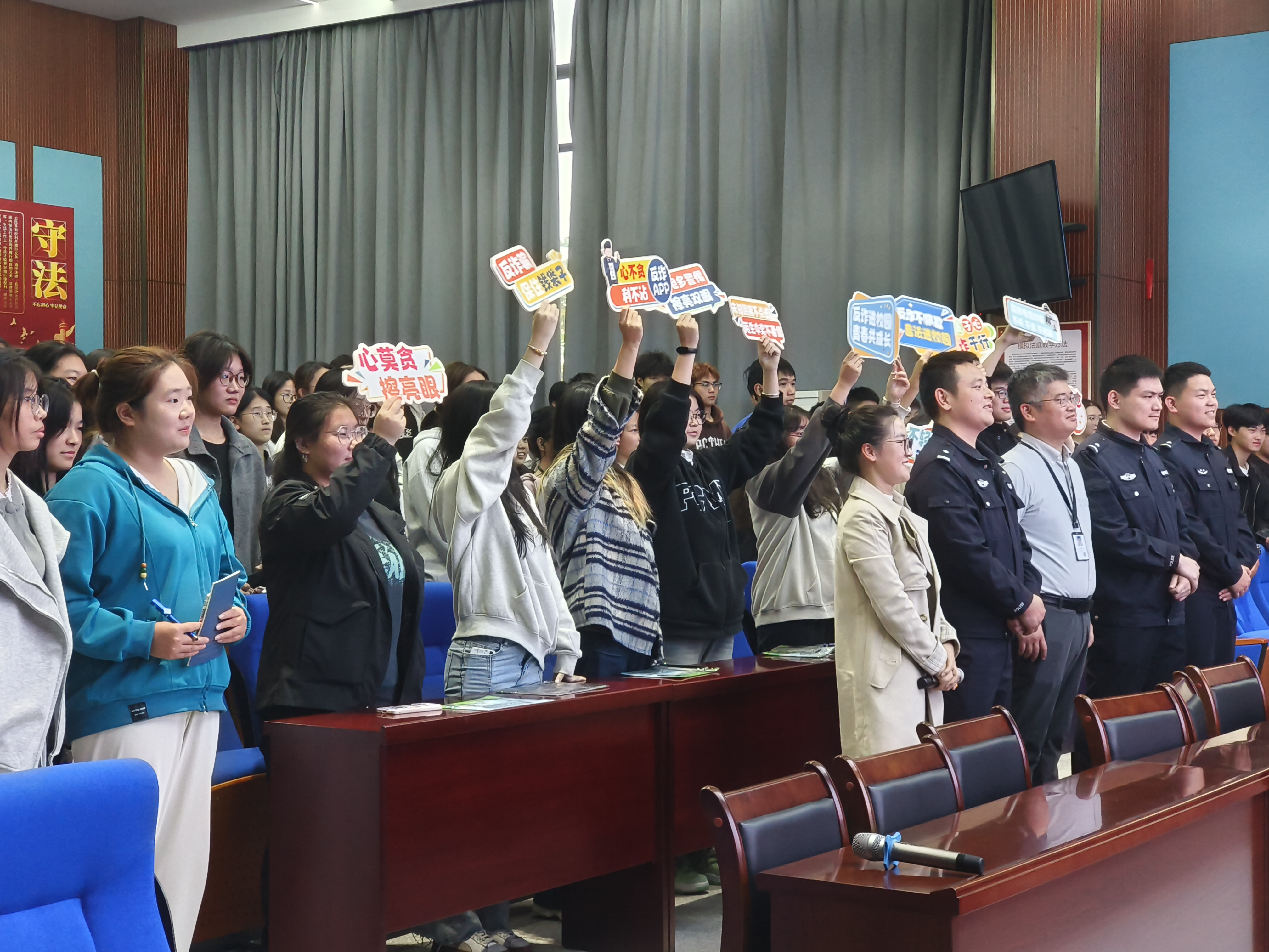 潘警官结合辖区高校易发的诈骗案件,选取典型案例,严肃而又不失幽默、生动形象、深入浅出地剖析了常见的刷单诈骗、游戏账号充值诈骗、网购诈骗、冒充熟人诈骗等诈骗陷阱,讲解了诈骗分子的作案手法和防骗技巧并总结出“三不一多”的防诈法宝:未知链接不点击,陌生来电不轻信,个人信息不透漏,转账汇款多核实。此外,他巧妙地设置现场测试,通过互动抢答,思维训练,将讲座推向了高潮,同学们积极响应,反应迅速、机智应对,与民警互动交流,现场气氛热烈而有序。在轻松、活泼的氛围中,同学们巩固了防诈反诈知识,增强了同学们对电信网络诈骗的防范意识和识别能力。