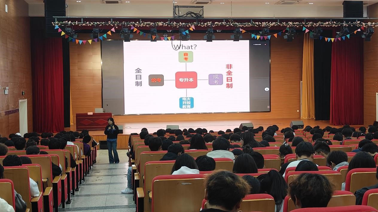 蔡甜甜为同学们带来了最新、最全的学历提升政策解读,重点向同学们介绍了学历提升的最佳途径:专本同读,在读大专的同时攻读本科,这在时间上、经济上都是一个非常理想的学历提升通道。她结合建工学子的专业特点,从专本同读的报考政策、报考流程、学习规划及备考策略等方面为学生们提供了全面而实用的指导。她建议同学们结合自身升学需求及能力评估做出切合实际的决定,并提醒同学们必须时刻把吃苦精神放在第一位,用心的学、刻苦的学,专注于一个领域并将涉及相关知识运用到学习与生活中去。她鼓励同学们未来是美好的,正值青春年华的青年学子只要努力拼搏,永不放弃,就有无限的可能性。