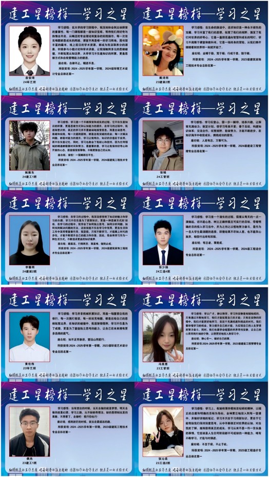 为表彰先进典型,激发学生学习热情,营造“比学赶超”的浓厚氛围,近日,建筑工程学院开展“建工星榜样——学习之星”评选活动,根据2024-2025学年第一学期学业成绩,评选出2023级和2024级各专业总分第一名,共十名优秀学生获得“学习之星”荣誉称号,并于3月3日在教学C楼进行海报展示。
