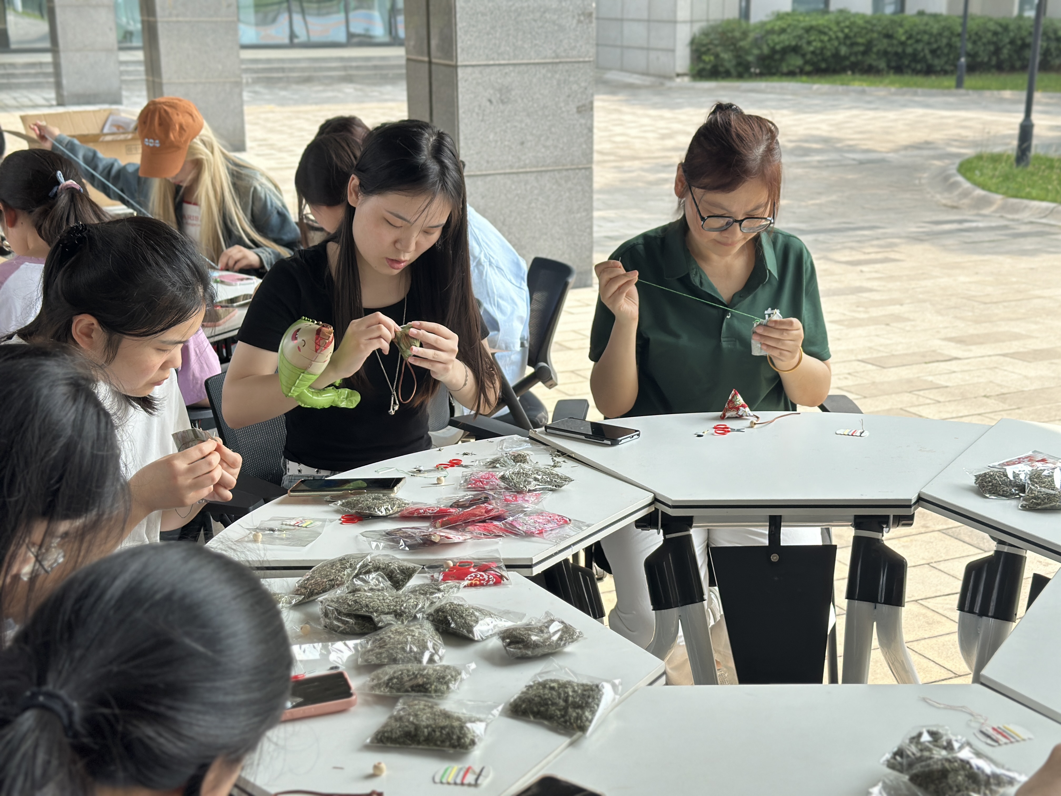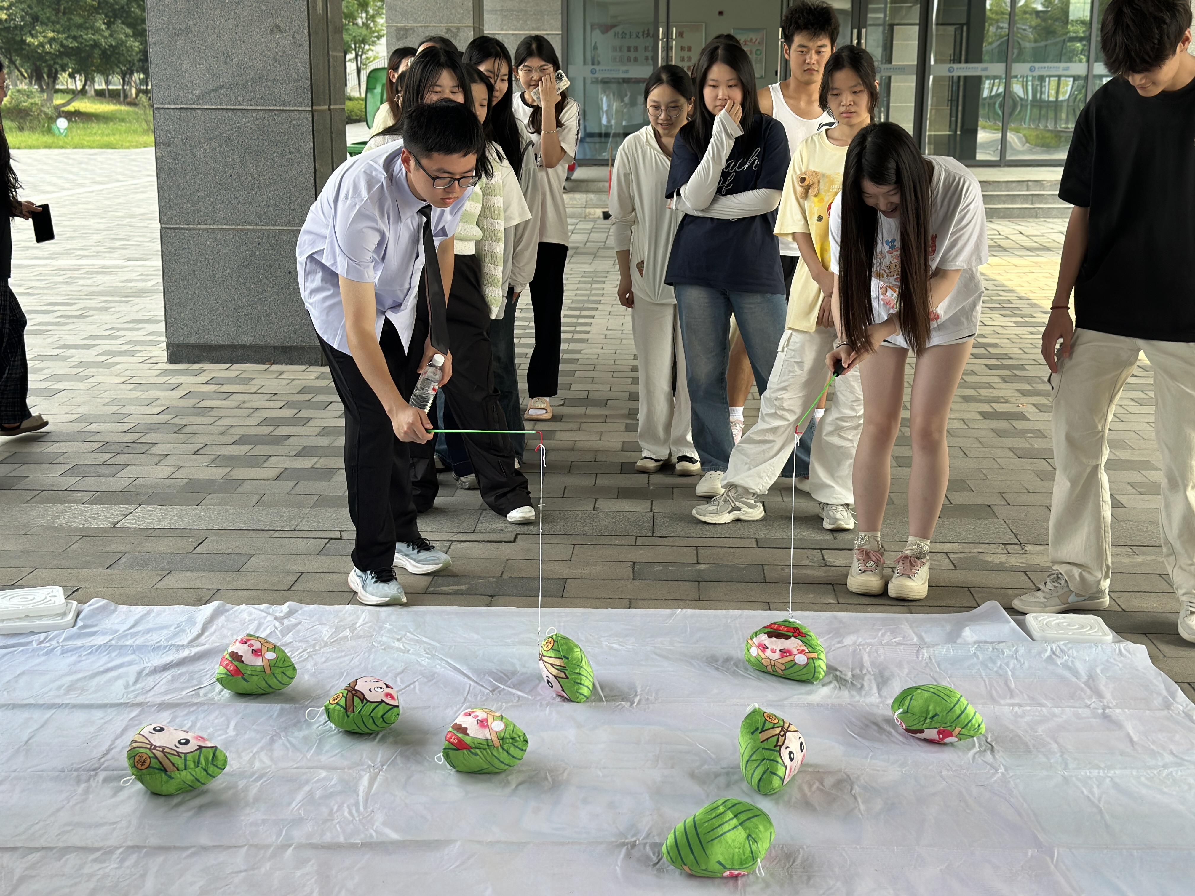 丰富多样的内容让现场热闹非凡,同学们纷纷加入到各个环节中。在极具传统竞技趣味的射五毒和投壶项目前,同学们排起长队,手持粽子玩偶和箭矢瞄准五毒和投壶,在驱灾纳福的传统游戏中展现青春风采。在钓粽子环节,同学们全神贯注挑战一分钟打捞“粽子”,以钓粽子的形式纪念屈原,以便能更深刻地感悟端午文化背后的家国情怀。手工制作区更是人气爆棚,同学们亲手编织五彩绳,将吉祥寓意缠绕于腕间;艾草香囊DIY活动中,大家穿针引线,将健康祝福缝于香囊之中;传统竹编龙舟小船搭配艾叶,满载着平安健康的祝愿。现场欢声笑语不断,既展现了传统节俗的独特魅力,也彰显了Beat365学子团结协作的精神风貌。