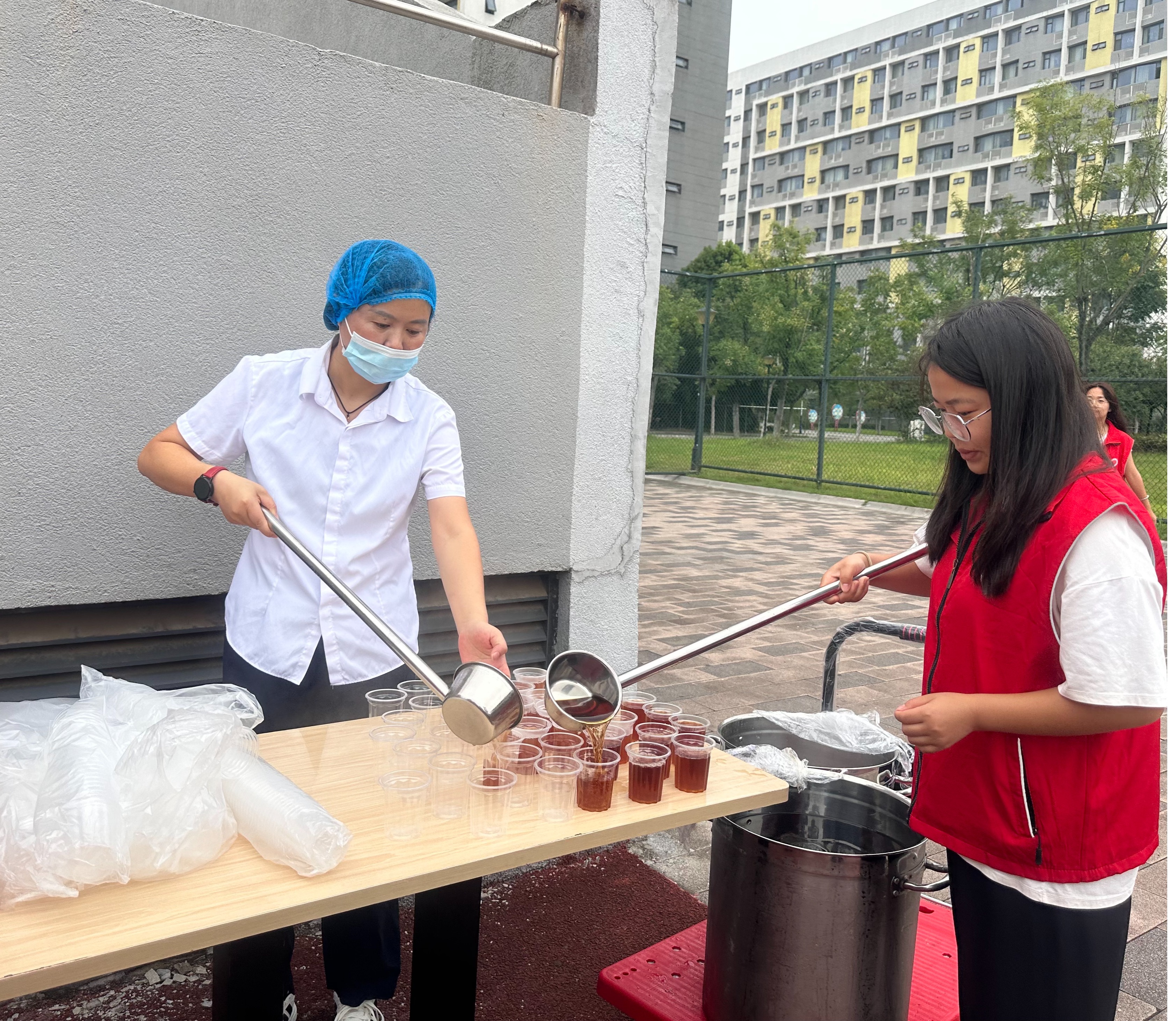 前期,两组织细化方案、统筹分工,学校食堂全力支持,精心熬制绿豆汤与酸梅汤,严守卫生关,保障饮用安全。活动当日,志愿者早早到场,高效完成汤品分装与摊位布置。新生训练间隙,领汤队伍有序排起,志愿者递汤、引导、暖心叮嘱,用热情驱散燥热。