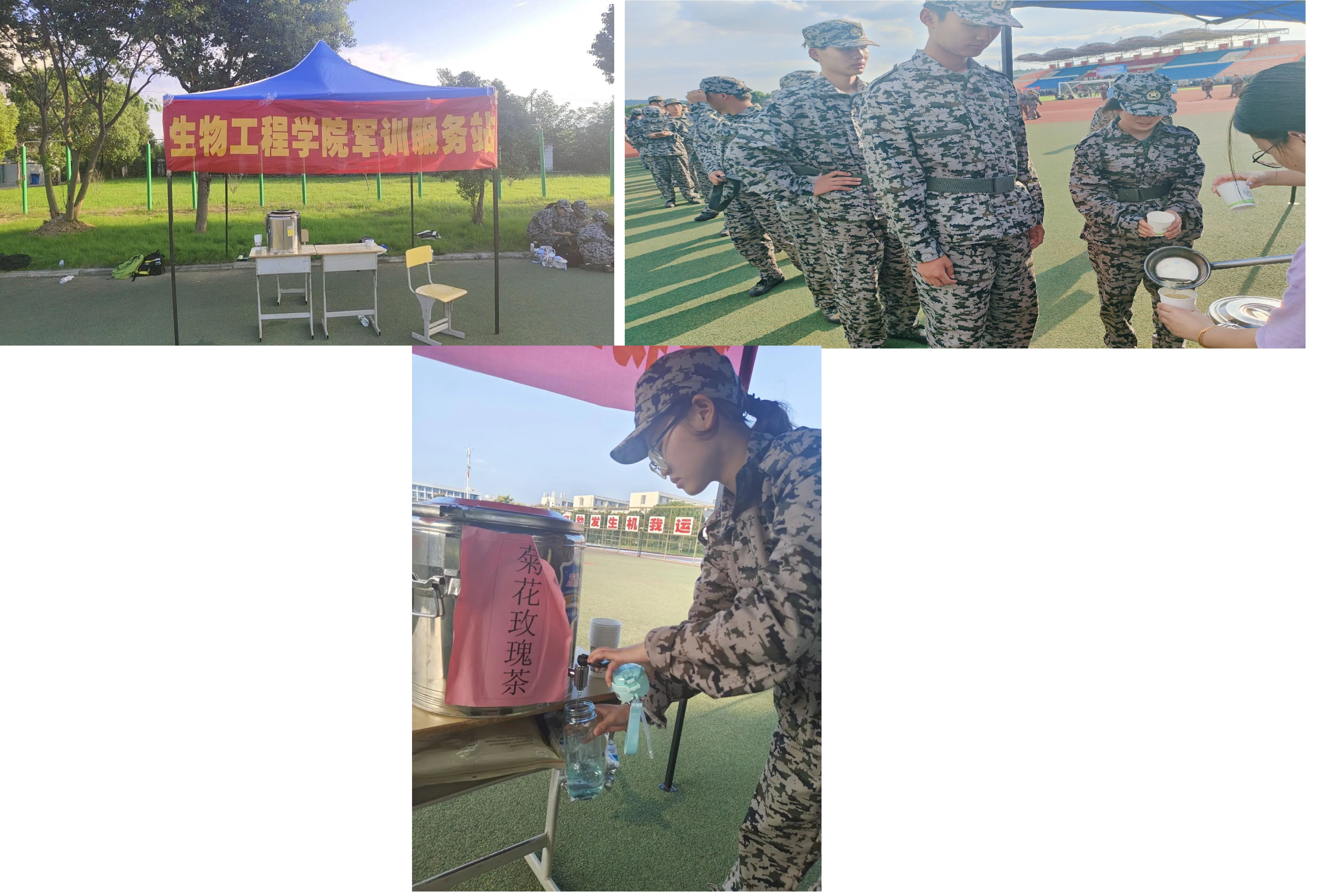 为了帮助新生更好地应对军训期间的高强度训练,缓解夏日的炎热与口渴,生物工程学院组建了军训服务站,学生志愿者于9月15日开始在田径场为全体25级新生及教官开展“军训砥砺,茶水助力”送茶活动。