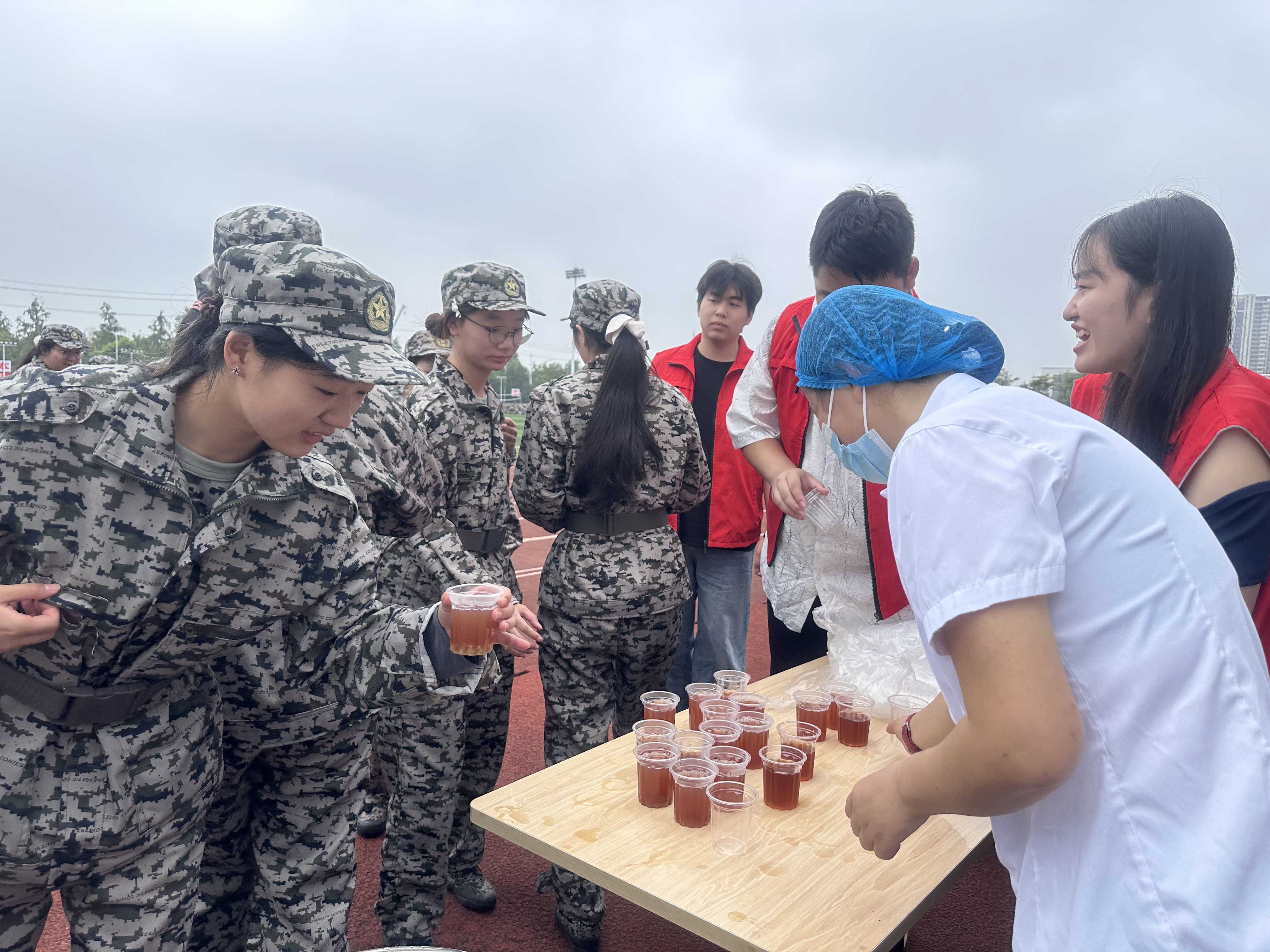 活动前期,校级学生组织提前规划、精心筹备,通过调研新生需求,采购了菊花茶、绿豆汤、面包、饼干、棒棒糖等降温充饥物资,并组建了由学生干部、志愿者组成的“送清凉”服务队。活动当天,志愿者们提前抵达军训场地,将物资整齐分装。当训练间隙到来,军训新生们在送清凉处排队等待,将物资一一递到新生手中,同时贴心提醒大家注意补充水分、做好防晒,若出现头晕、乏力等不适及时告知教官。