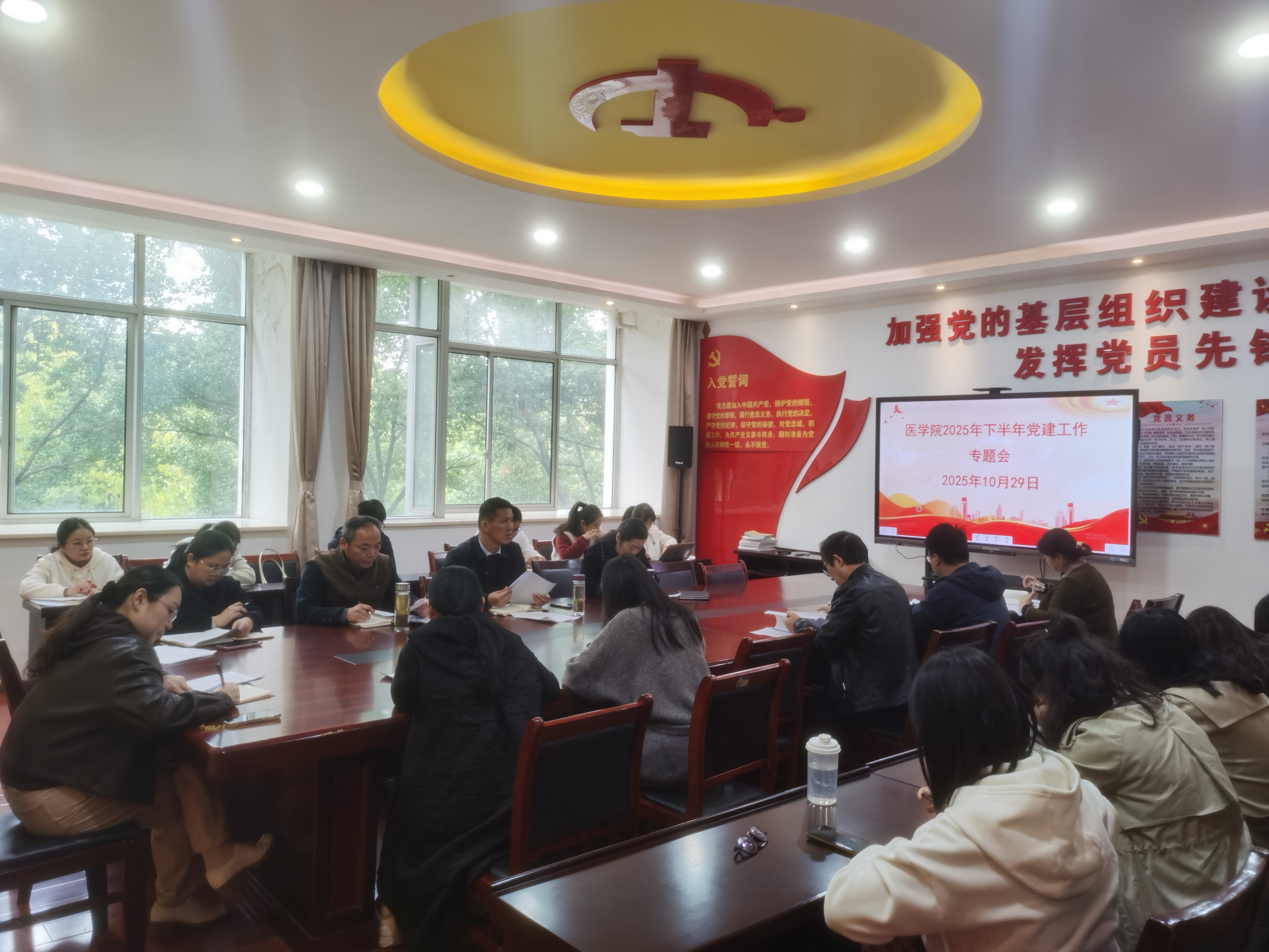 为全面提升医学院基层党组织党建工作水平,更好推进下半年该院党建工作有效开展,进一步夯实基层党组织建设,10月29日下午,医学院在医学楼214党员活动室召开2025年下半年党建重点工作推进会。医学院党总支副书记(主持工作)邹华兵主持会议,院长孙美兰出席会议并讲话,党总支委员、各党支部书记及委员参会。