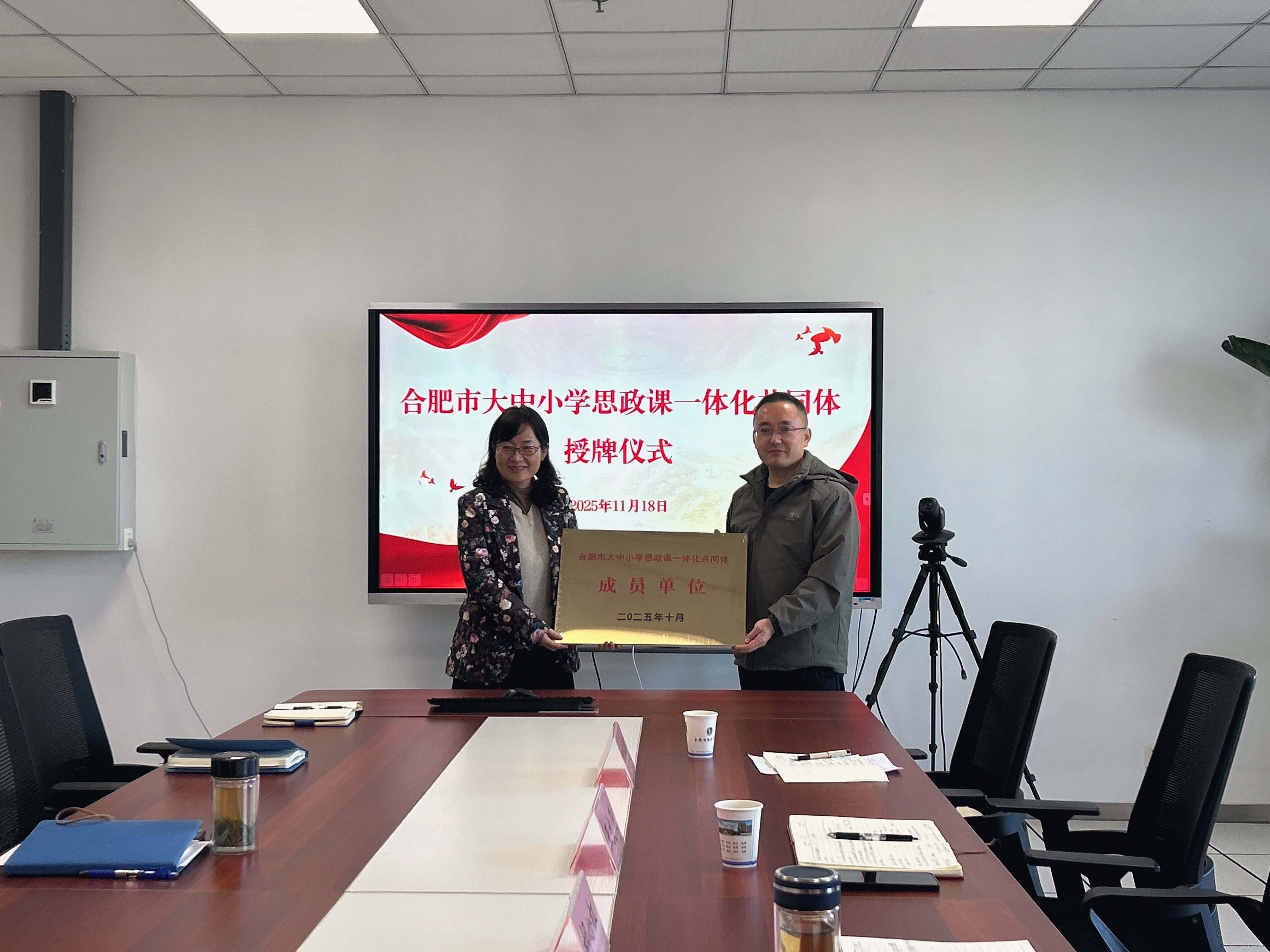 会上,王文飞重点介绍了马克思主义学院党建工作和合肥市大中小学思政课一体化共同体建设情况。他指出,共同体旨在打破学段壁垒,汇聚各方智慧,构建循序渐进、螺旋上升的思政育人体系。此次将特教中心纳入共同体,是推动思政教育全覆盖、实现教育公平的重要步骤,标志着共同体建设在领域拓展上取得了新的突破。随后,王文飞代表合肥市大中小学思政课一体化共同体向合肥特殊教育中心授予了“成员单位”牌匾。