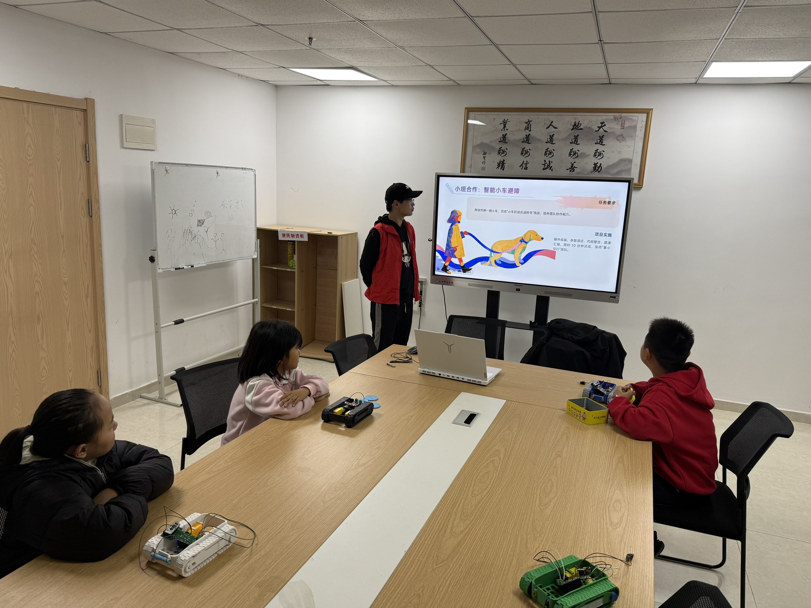 课程特别设计“廉洁文化”情景模拟环节,志愿者们引导学生用编程指令为机器人设置“拒收礼盒”“按规行驶”等交互行为,以“科技+德育”的创新形式,让廉洁意识如种子般深植童心。