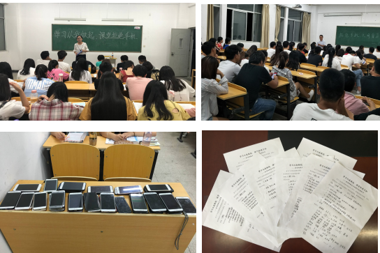 9月5日晚,各班主任辅导员老师在班级及时召开“学习从我做起,课堂拒绝手机”的主题班会,对开展文明晚自习活动进行宣传、布置,并组织学生签订承诺书。活动得到同学们的积极响应,纷纷表示决不让手机“绑架”我们的生活,影响了我们的学习。学生当晚开始就把手机统一放在前排。